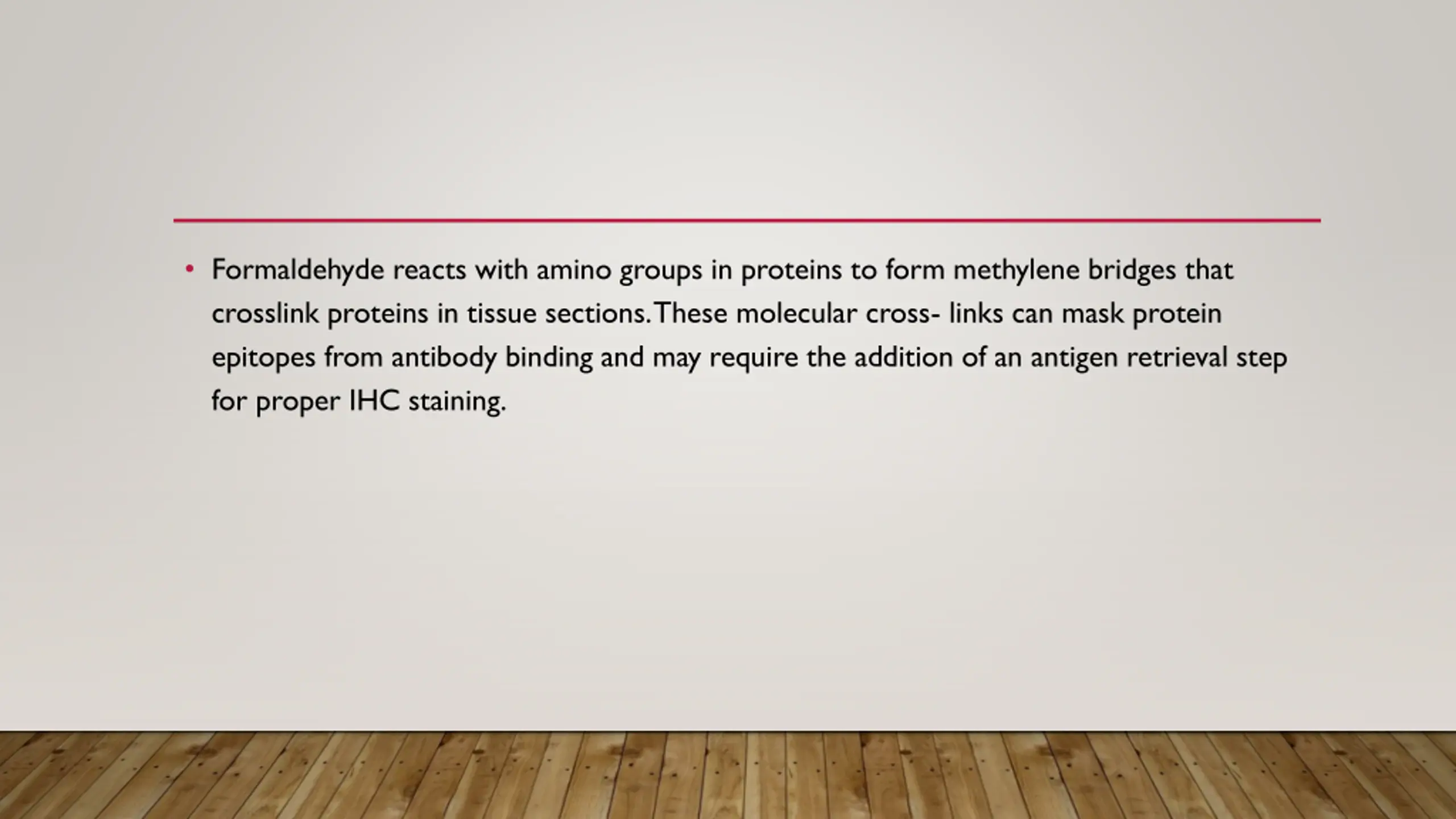Formaldehyde reacts with amino groups in proteins to form methylene bridges that crosslink proteins in tissue sections. These molecular cross- links can mask protein epitopes from antibody binding and may require the addition of an antigen retrieval step for proper IHC staining.