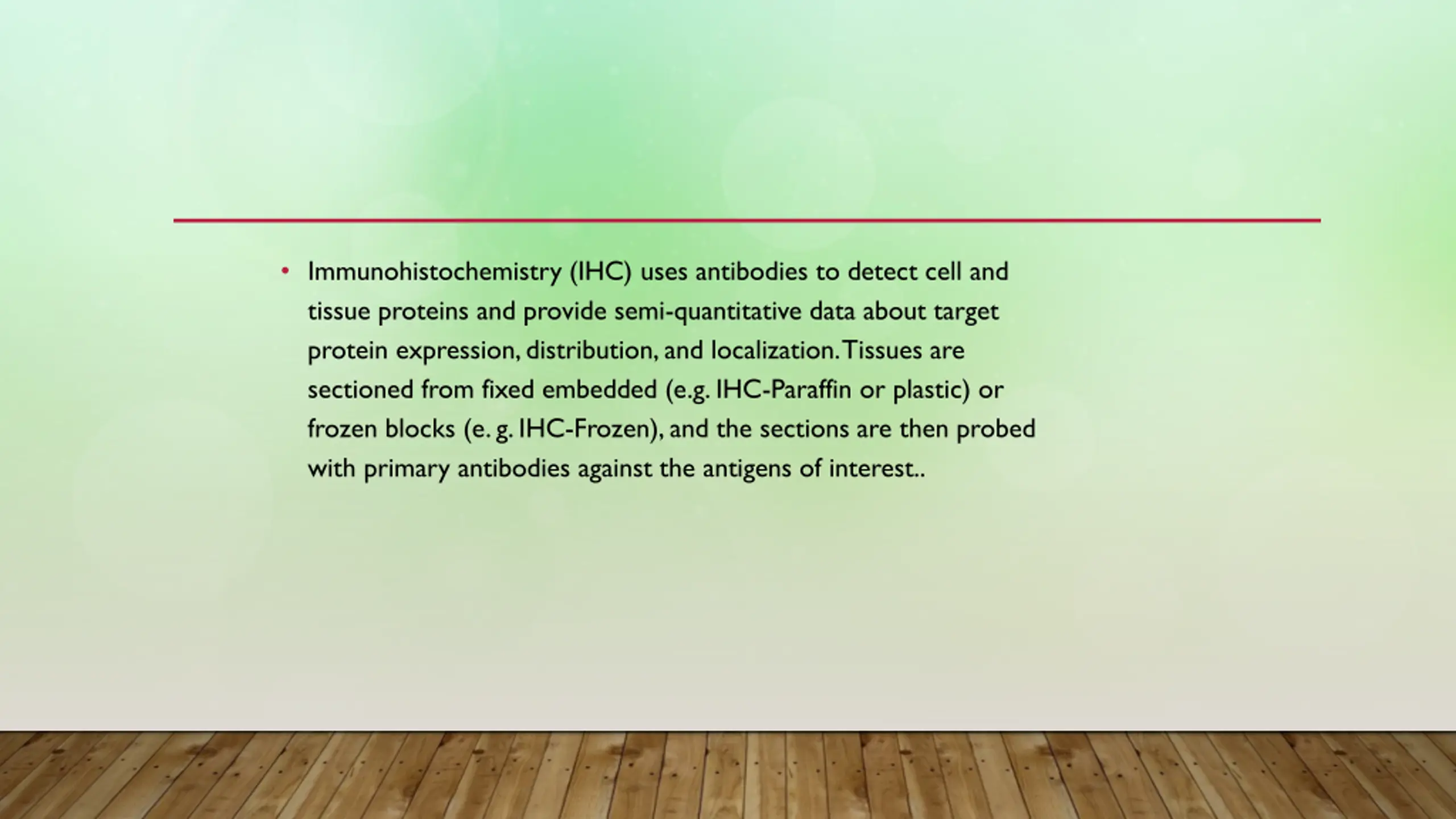 Immunohistochemistry (IHC) uses antibodies to detect cell and tissue proteins and provide semi-quantitative data about target protein expression, distribution, and localization. Tissues are sectioned from fixed embedded (e.g. IHC-Paraffin or plastic) or frozen blocks (e. g. IHC-Frozen), and the sections are then probed with primary antibodies against the antigens of interest..