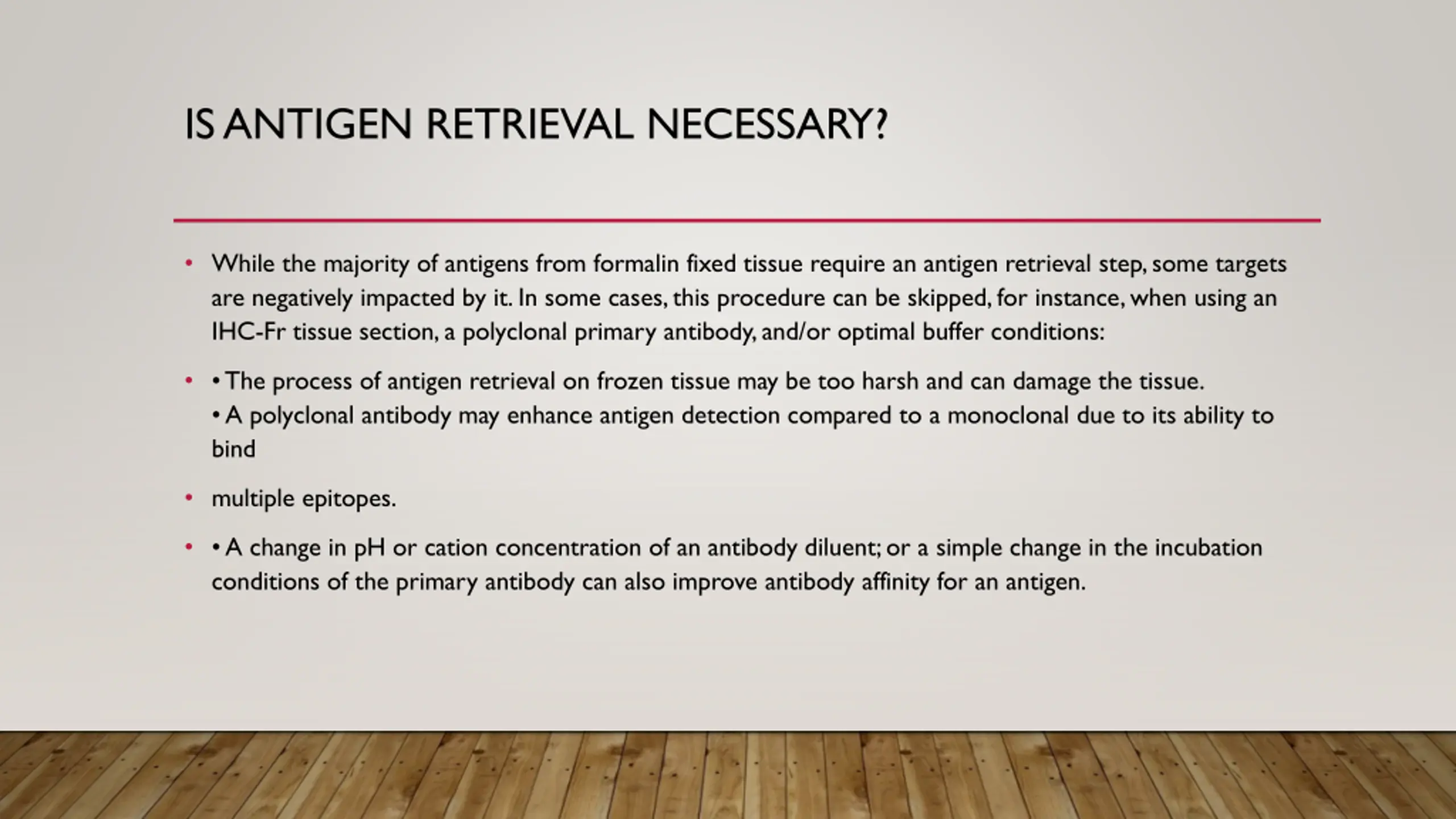 IS ANTIGEN RETRIEVAL NECESSARY? While the majority of antigens from formalin fixed tissue require an antigen retrieval step, some targets are negatively impacted by it. In some cases, this procedure can be skipped, for instance, when using an IHC-Fr tissue section, a polyclonal primary antibody, and/or optimal buffer conditions: The process of antigen retrieval on frozen tissue may be too harsh and can damage the tissue. A polyclonal antibody may enhance antigen detection compared to a monoclonal due to its ability to bind multiple epitopes. A change in pH or cation concentration of an antibody diluent; or a simple change in the incubation conditions of the primary antibody can also improve antibody affinity for an antigen.
