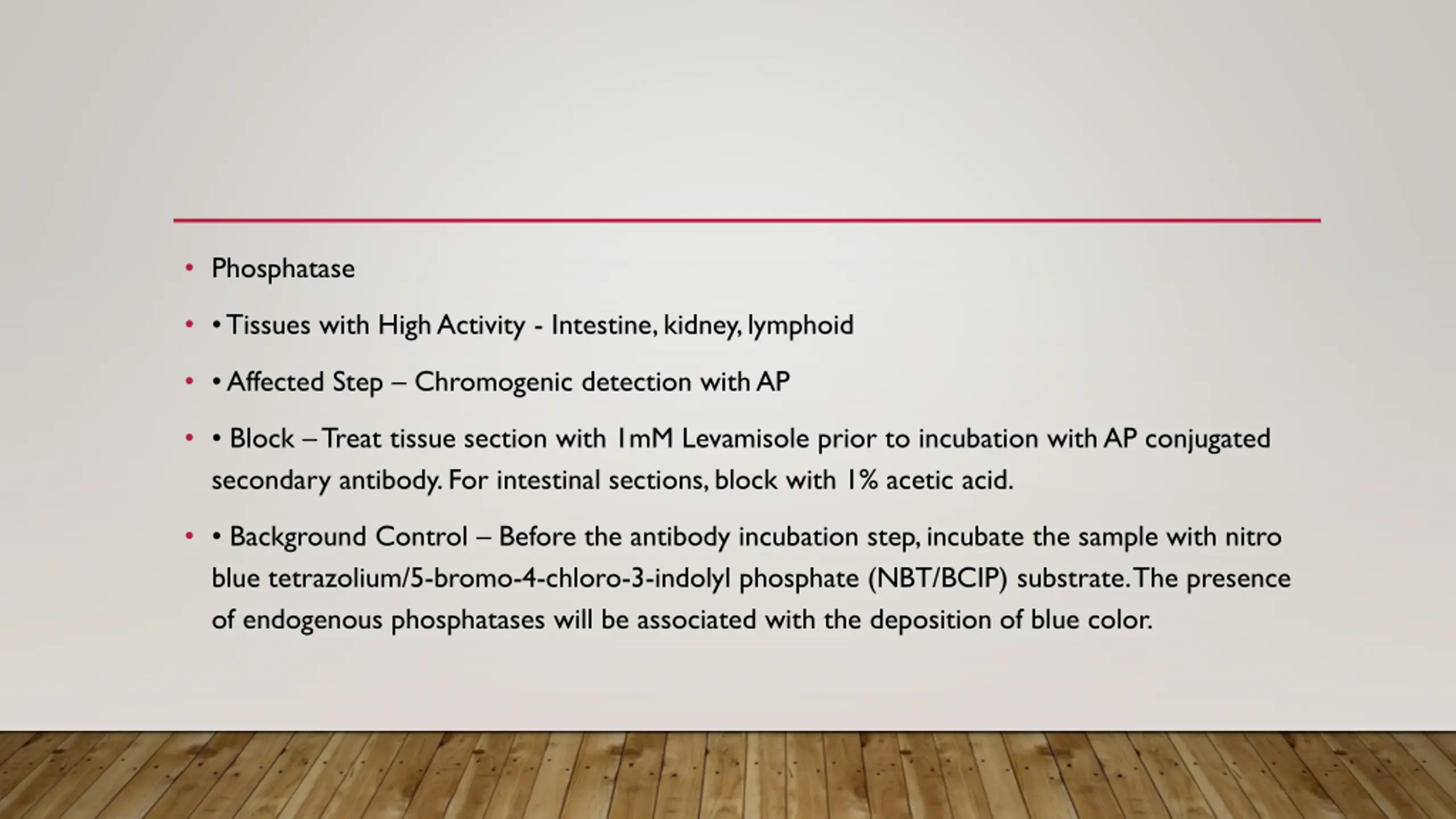 Phosphatase Tissues with High Activity - Intestine, kidney, lymphoid Affected Step Chromogenic detection with AP Block Treat tissue section with 1mM Levamisole prior to incubation with AP conjugated secondary antibody. For intestinal sections, block with 1% acetic acid. Background Control Before the antibody incubation step, incubate the sample with nitro blue tetrazolium/5-bromo-4-chloro-3-indolyl phosphate (NBT/BCIP) substrate. The presence of endogenous phosphatases will be associated with the deposition of blue color.