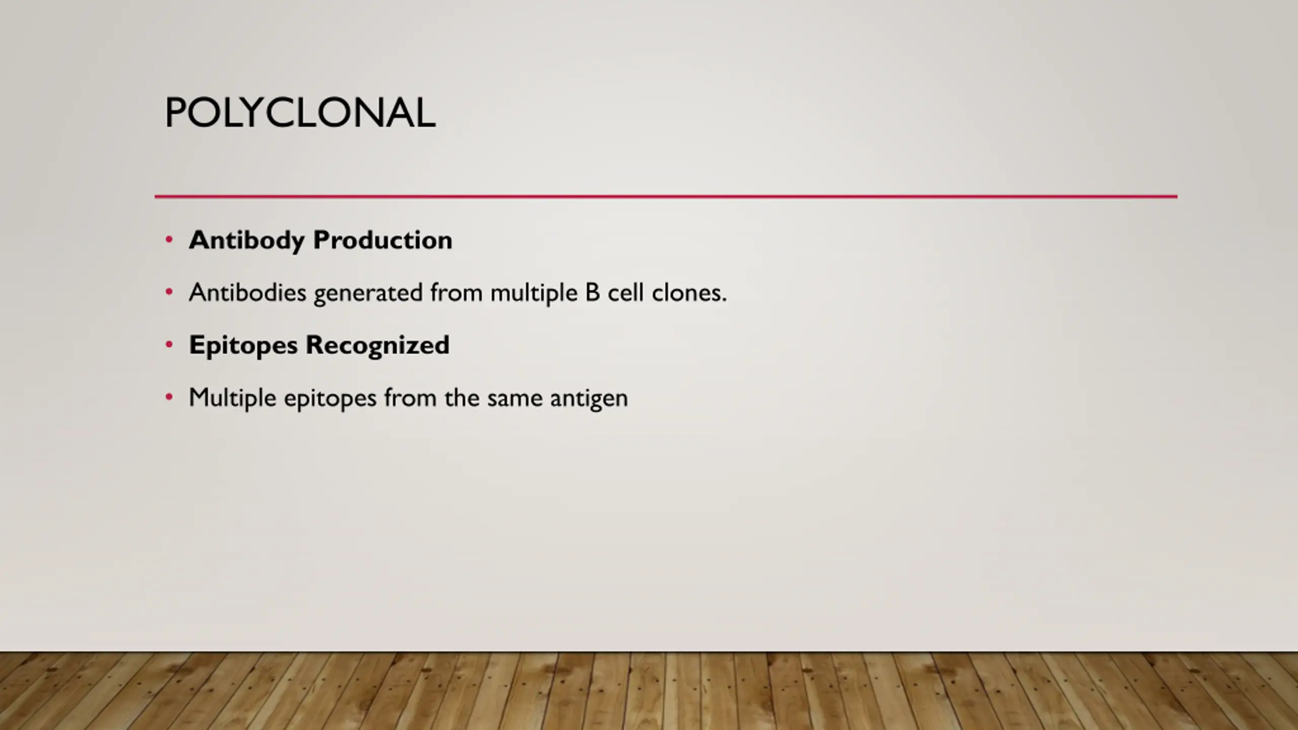 POLYCLONAL Antibody Production Antibodies generated from multiple B cell clones. Epitopes Recognized Multiple epitopes from the same antigen