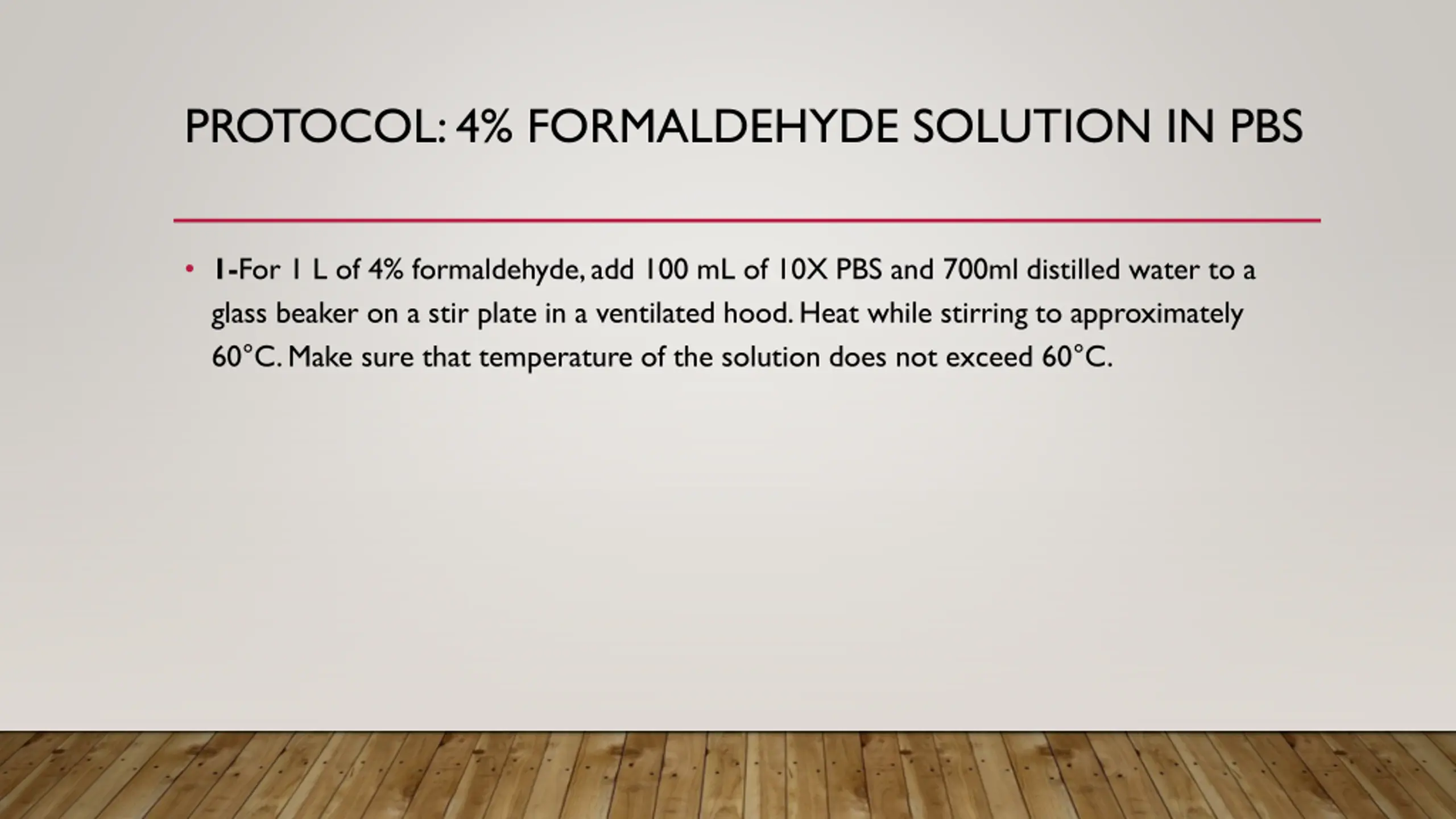 PROTOCOL: 4% FORMALDEHYDE SOLUTION IN PBS 1-For 1 L of 4% formaldehyde, add 100 mL of 10X PBS and 700ml distilled water to a glass beaker on a stir plate in a ventilated hood. Heat while stirring to approximately 60 C. Make sure that temperature of the solution does not exceed 60 C.
