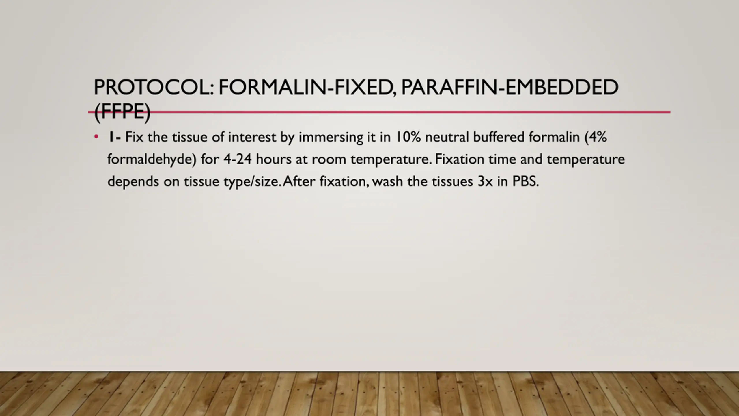 PROTOCOL: FORMALIN-FIXED, PARAFFIN-EMBEDDED (FFPE) 1- Fix the tissue of interest by immersing it in 10% neutral buffered formalin (4% formaldehyde) for 4-24 hours at room temperature. Fixation time and temperature depends on tissue type/size. After fixation, wash the tissues 3x in PBS.