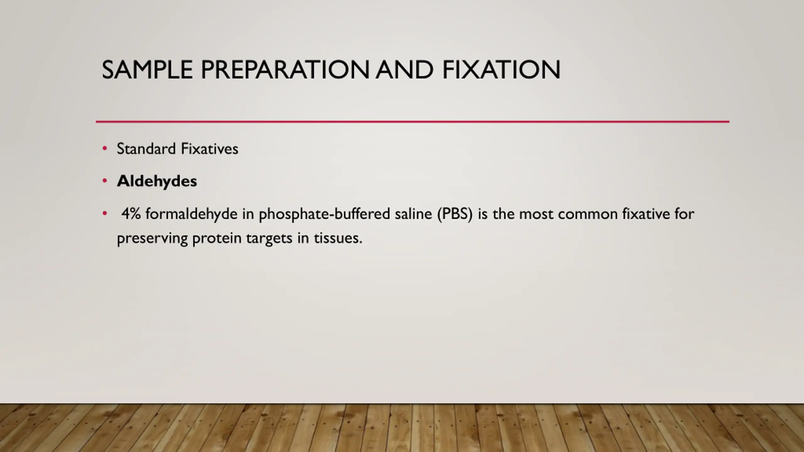 SAMPLE PREPARATION AND FIXATION Standard Fixatives Aldehydes 4% formaldehyde in phosphate-buffered saline (PBS) is the most common fixative for preserving protein targets in tissues.