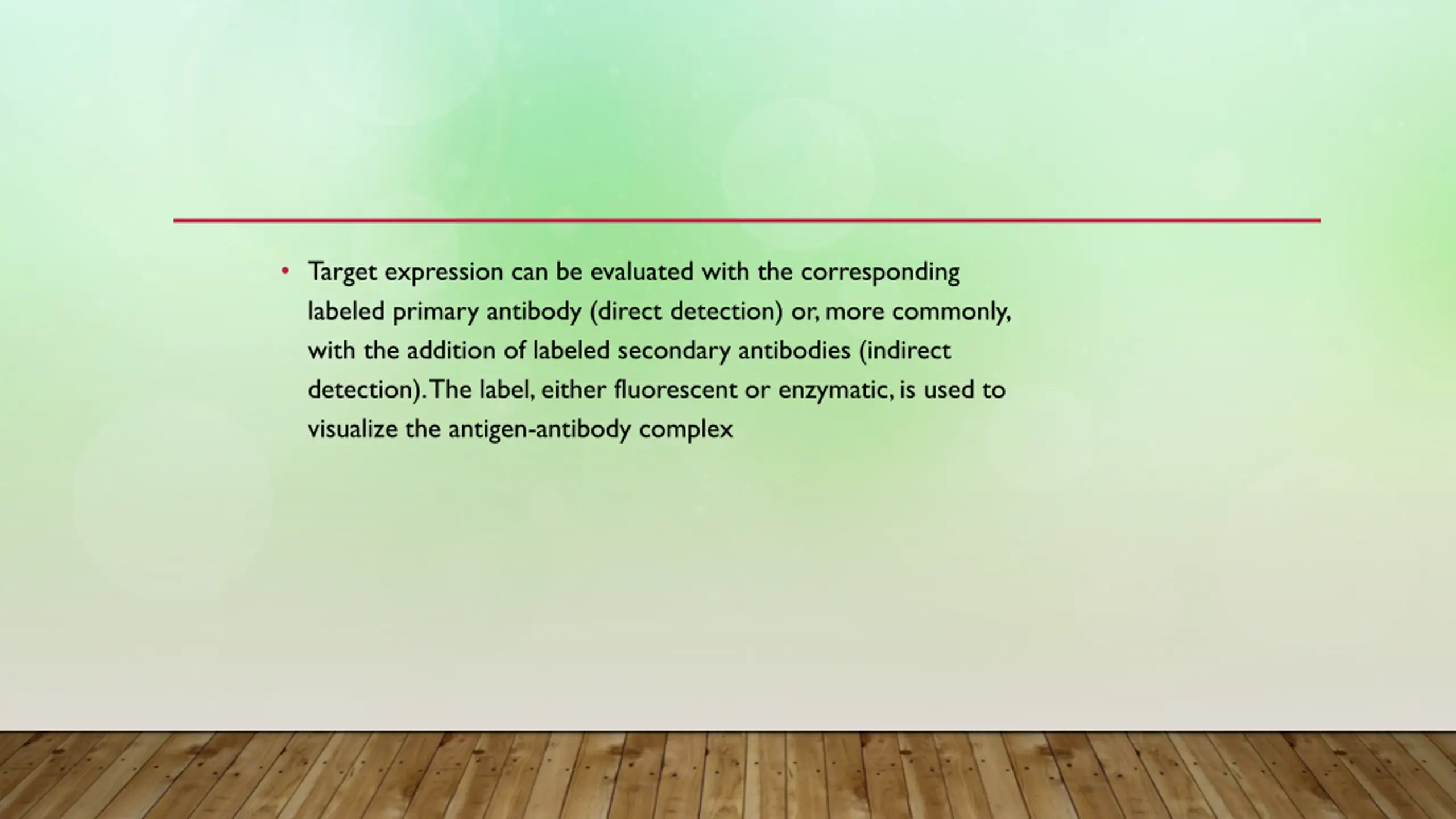 Target expression can be evaluated with the corresponding labeled primary antibody (direct detection) or, more commonly, with the addition of labeled secondary antibodies (indirect detection). The label, either fluorescent or enzymatic, is used to visualize the antigen-antibody complex