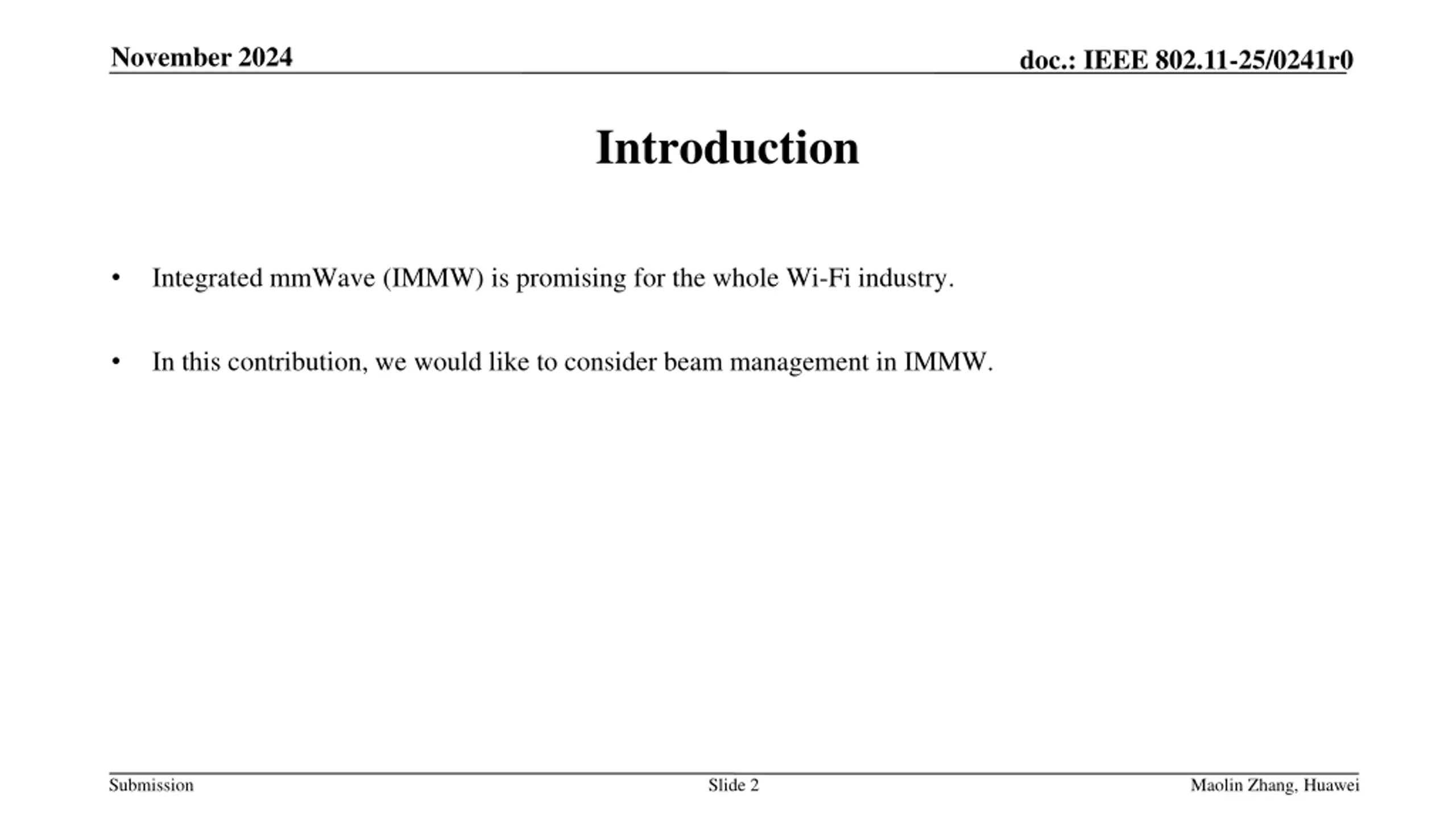 November 2024 doc.: IEEE 802.11-25/0241r0 Introduction Integrated mmWave (IMMW) is promising for the whole Wi-Fi industry. In this contribution, we would like to consider beam management in IMMW. Submission Slide 2 Maolin Zhang, Huawei