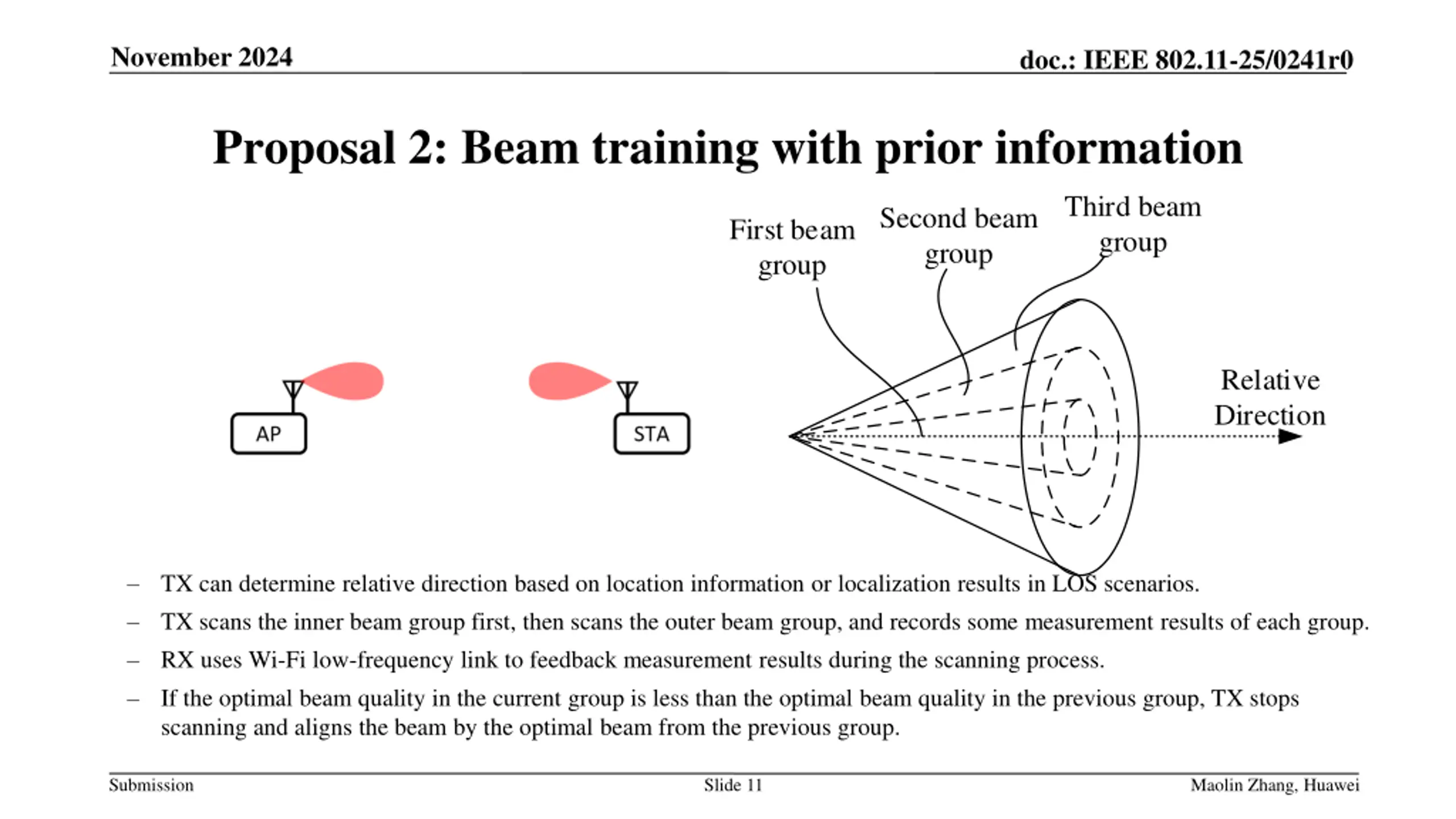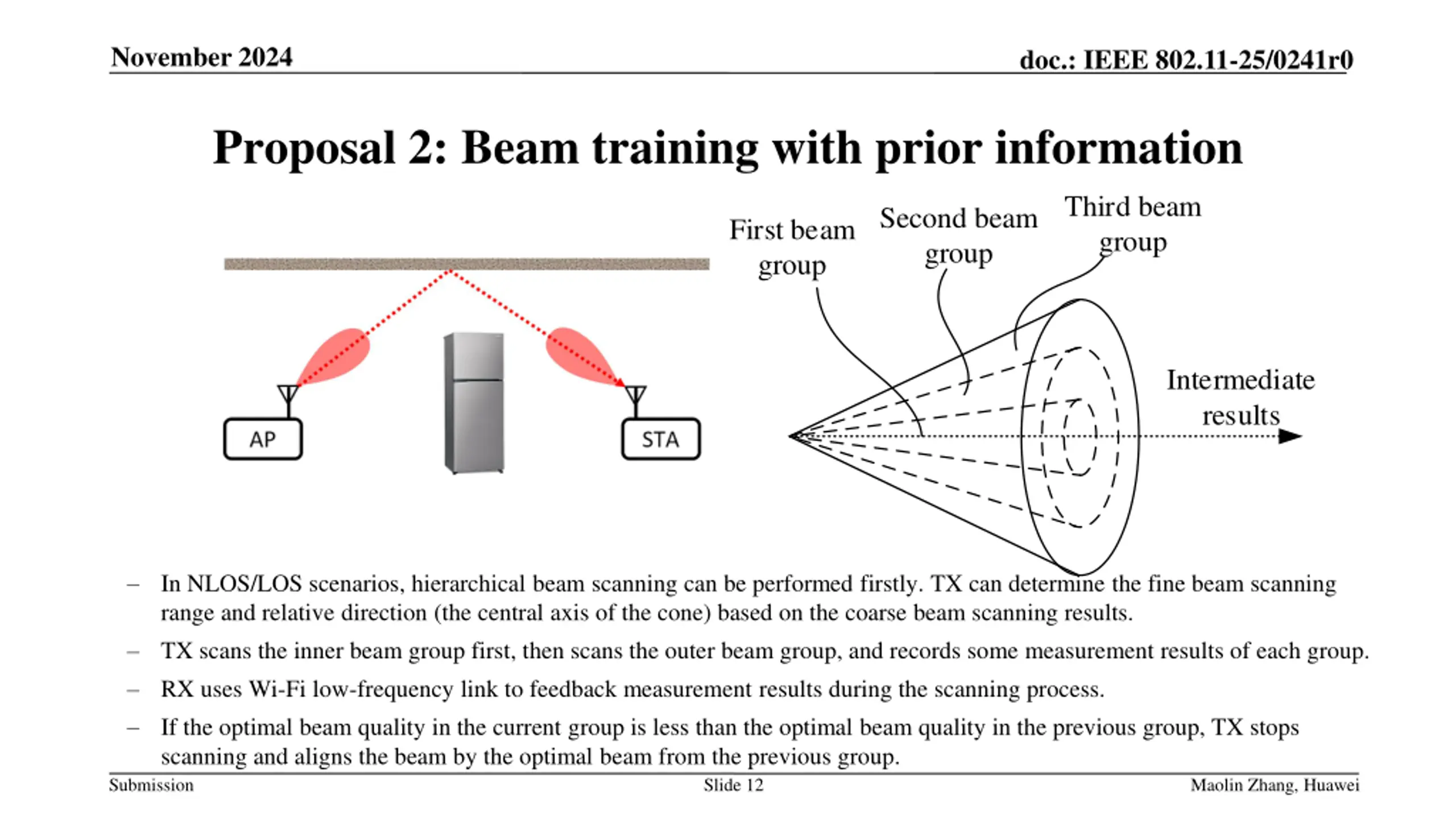 November 2024 doc.: IEEE 802.11-25/0241r0 Proposal 2: Beam training with prior information Third beam group Second beam group First beam group Relative Direction TX can determine relative direction based on location information or localization results in LOS scenarios. TX scans the inner beam group first, then scans the outer beam group, and records some measurement results of each group. RX uses Wi-Fi low-frequency link to feedback measurement results during the scanning process. If the optimal beam quality in the current group is less than the optimal beam quality in the previous group, TX stops scanning and aligns the beam by the optimal beam from the previous group. Submission Slide 11 Maolin Zhang, Huawei