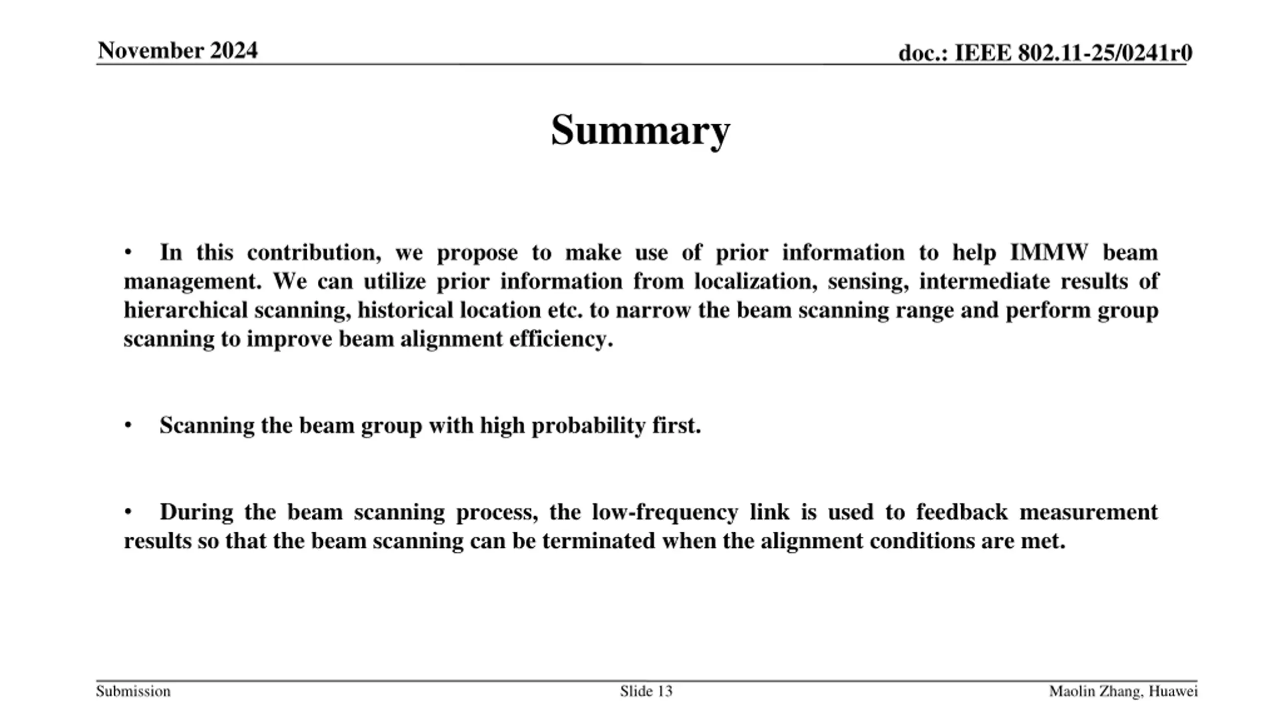 November 2024 doc.: IEEE 802.11-25/0241r0 Proposal 2: Beam training with prior information Third beam group Second beam group First beam group Intermediate results In NLOS/LOS scenarios, hierarchical beam scanning can be performed firstly. TX can determine the fine beam scanning range and relative direction (the central axis of the cone) based on the coarse beam scanning results. TX scans the inner beam group first, then scans the outer beam group, and records some measurement results of each group. RX uses Wi-Fi low-frequency link to feedback measurement results during the scanning process. If the optimal beam quality in the current group is less than the optimal beam quality in the previous group, TX stops scanning and aligns the beam by the optimal beam from the previous group. Submission Slide 12 Maolin Zhang, Huawei