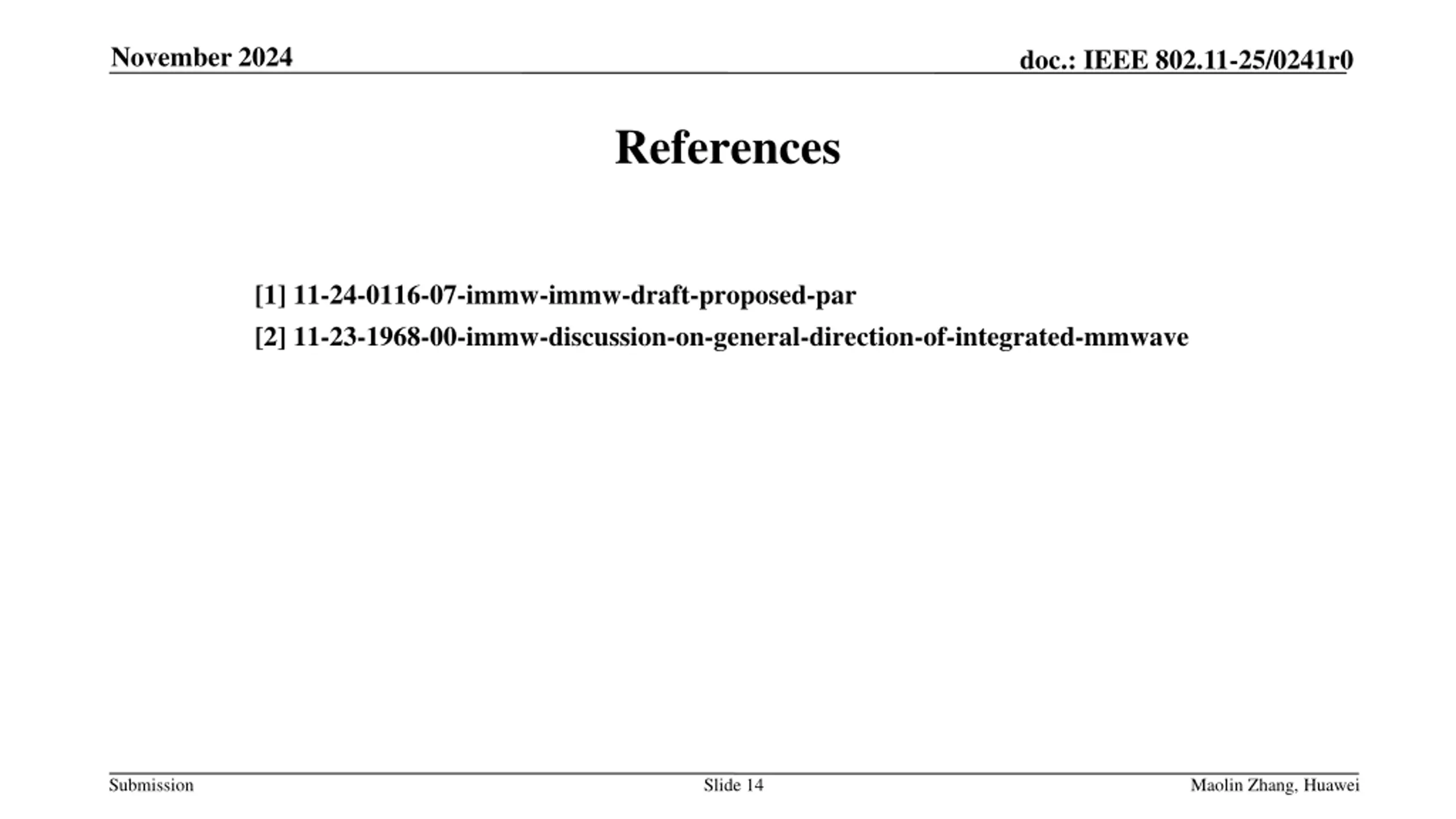 November 2024 doc.: IEEE 802.11-25/0241r0 References [1] 11-24-0116-07-immw-immw-draft-proposed-par [2] 11-23-1968-00-immw-discussion-on-general-direction-of-integrated-mmwave Submission Slide 14 Maolin Zhang, Huawei