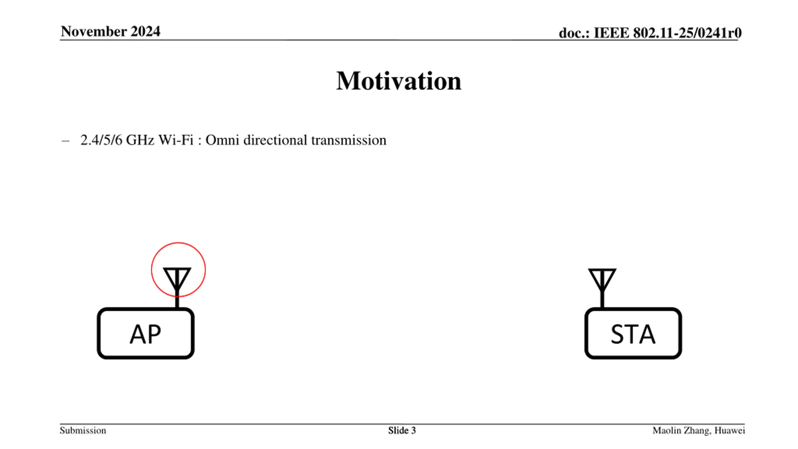 November 2024 doc.: IEEE 802.11-25/0241r0 Motivation 2.4/5/6 GHz Wi-Fi : Omni directional transmission AP STA Submission Slide 3 Slide 3 Maolin Zhang, Huawei