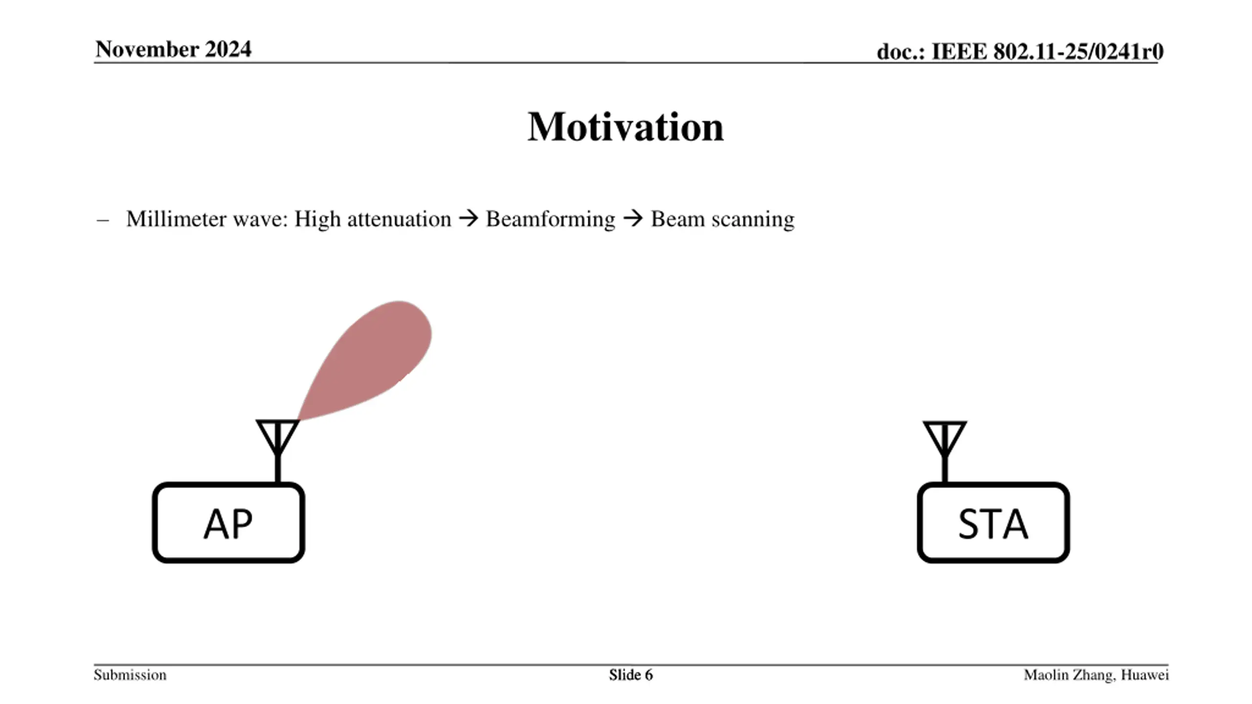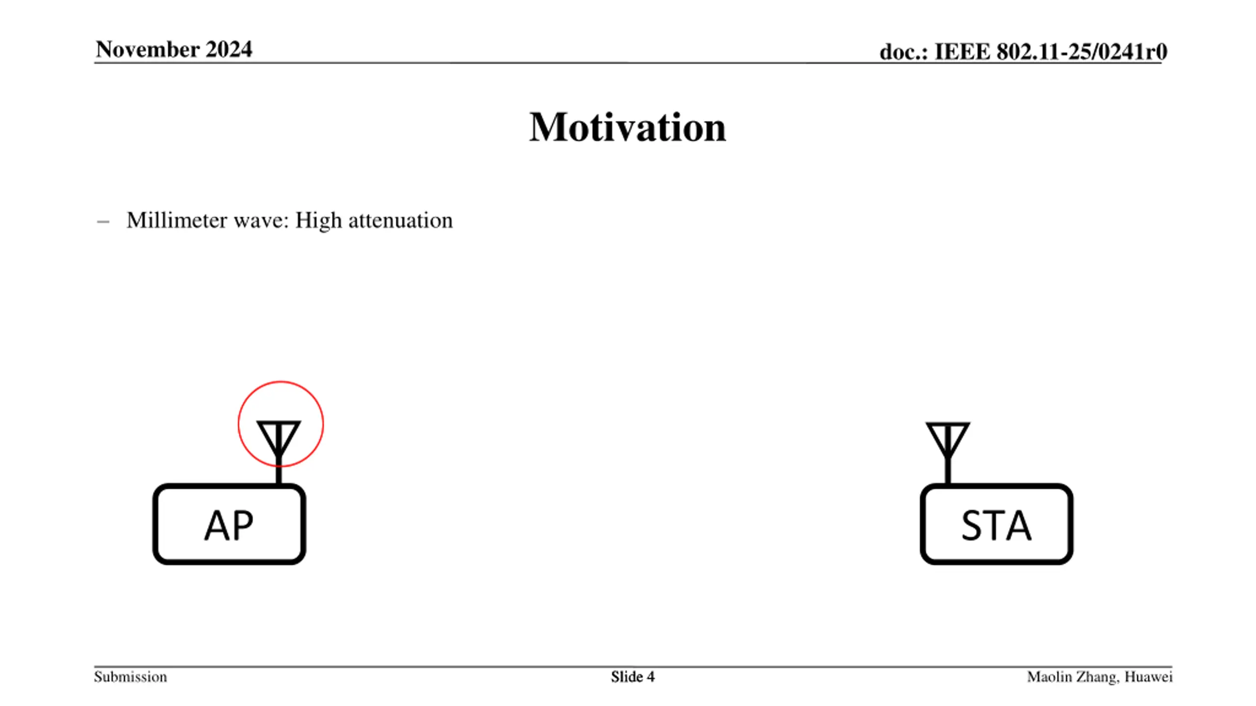 November 2024 doc.: IEEE 802.11-25/0241r0 Motivation Millimeter wave: High attenuation AP STA Submission Slide 4 Slide 4 Maolin Zhang, Huawei