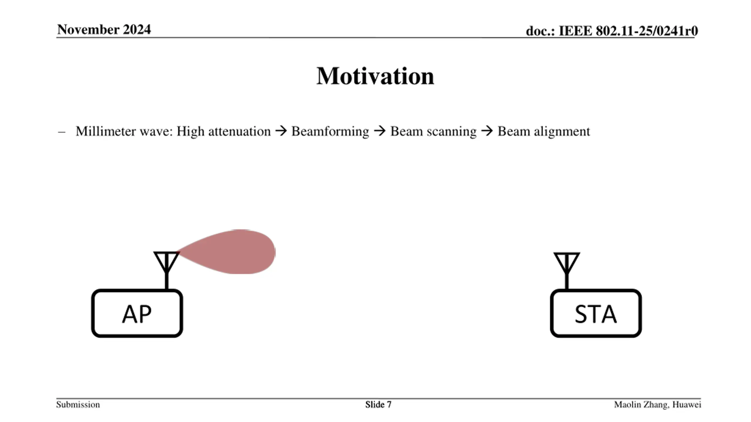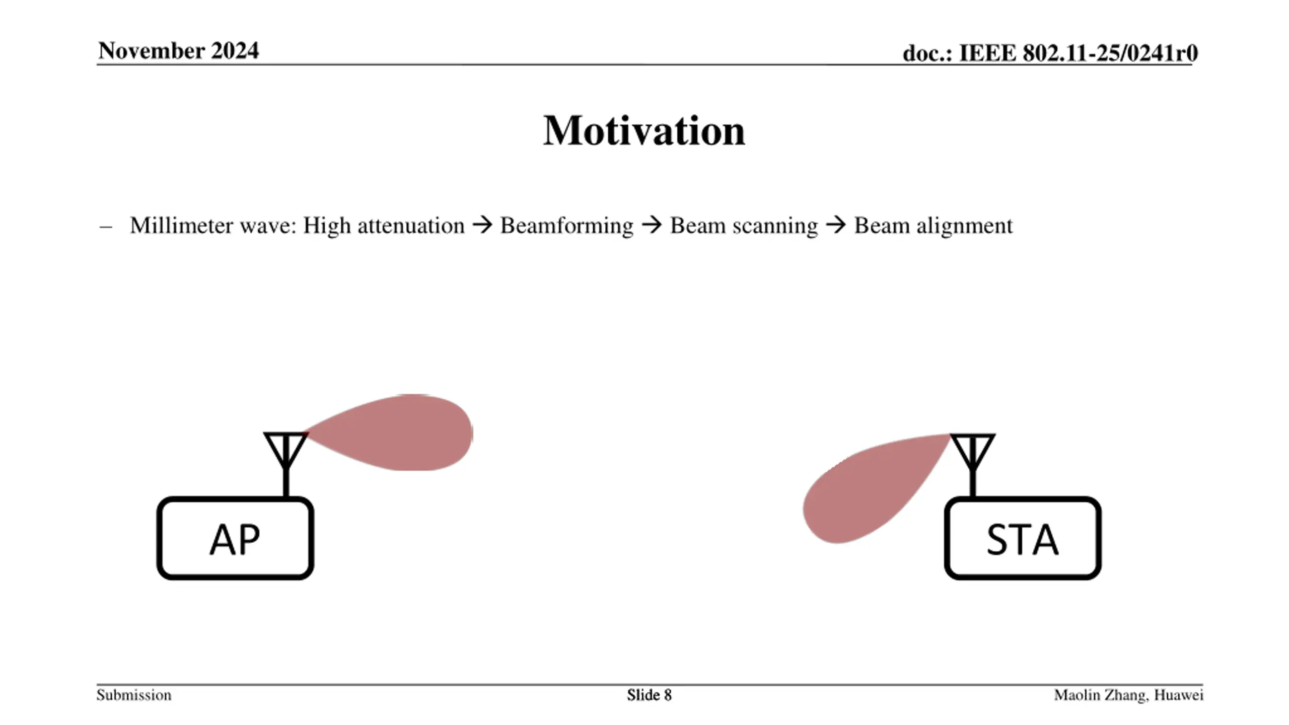 November 2024 doc.: IEEE 802.11-25/0241r0 Motivation Millimeter wave: High attenuation Beamforming Beam scanning Beam alignment AP STA Submission Slide 7 Slide 7 Maolin Zhang, Huawei