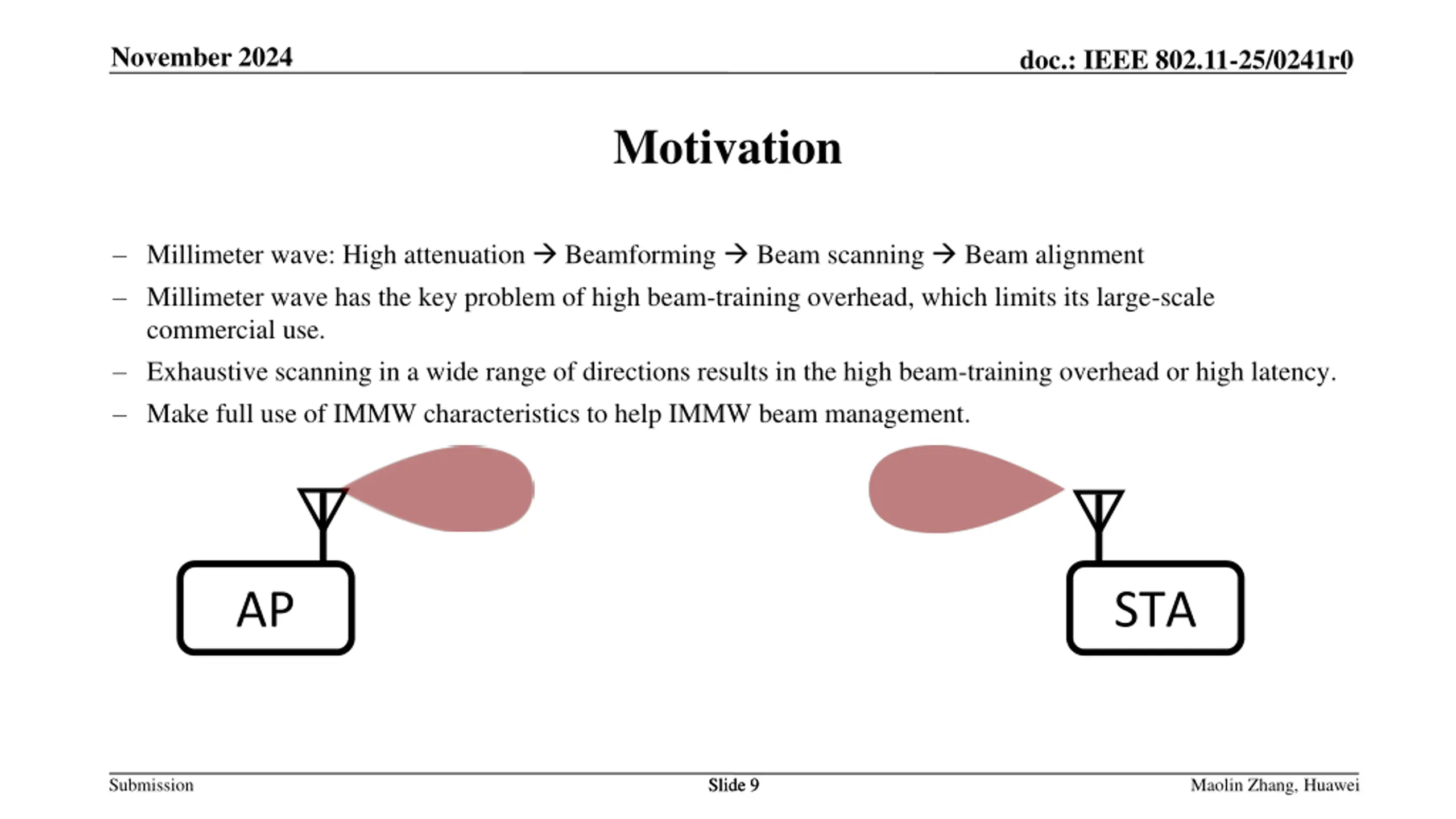 November 2024 doc.: IEEE 802.11-25/0241r0 Motivation Millimeter wave: High attenuation Beamforming Beam scanning Beam alignment AP STA Submission Slide 8 Slide 8 Maolin Zhang, Huawei