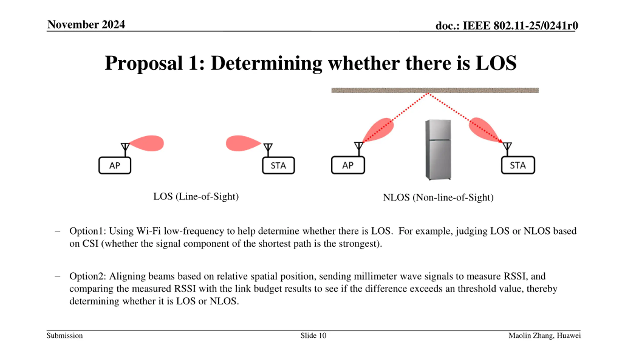 November 2024 doc.: IEEE 802.11-25/0241r0 Proposal 1: Determining whether there is LOS LOS (Line-of-Sight) NLOS (Non-line-of-Sight) Option1: Using Wi-Fi low-frequency to help determine whether there is LOS. For example, judging LOS or NLOS based on CSI (whether the signal component of the shortest path is the strongest). Option2: Aligning beams based on relative spatial position, sending millimeter wave signals to measure RSSI, and comparing the measured RSSI with the link budget results to see if the difference exceeds an threshold value, thereby determining whether it is LOS or NLOS. Submission Slide 10 Maolin Zhang, Huawei