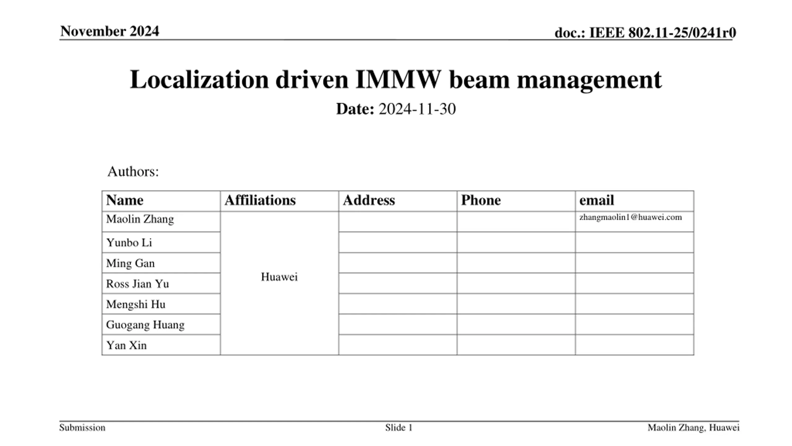 November 2024 doc.: IEEE 802.11-25/0241r0 Localization driven IMMW beam management Date: 2024-11-30 Authors: Name Maolin Zhang Affiliations Address Phone email zhangmaolin1@huawei.com Yunbo Li Ming Gan Huawei Ross Jian Yu Mengshi Hu Guogang Huang Yan Xin Submission Slide 1 Maolin Zhang, Huawei