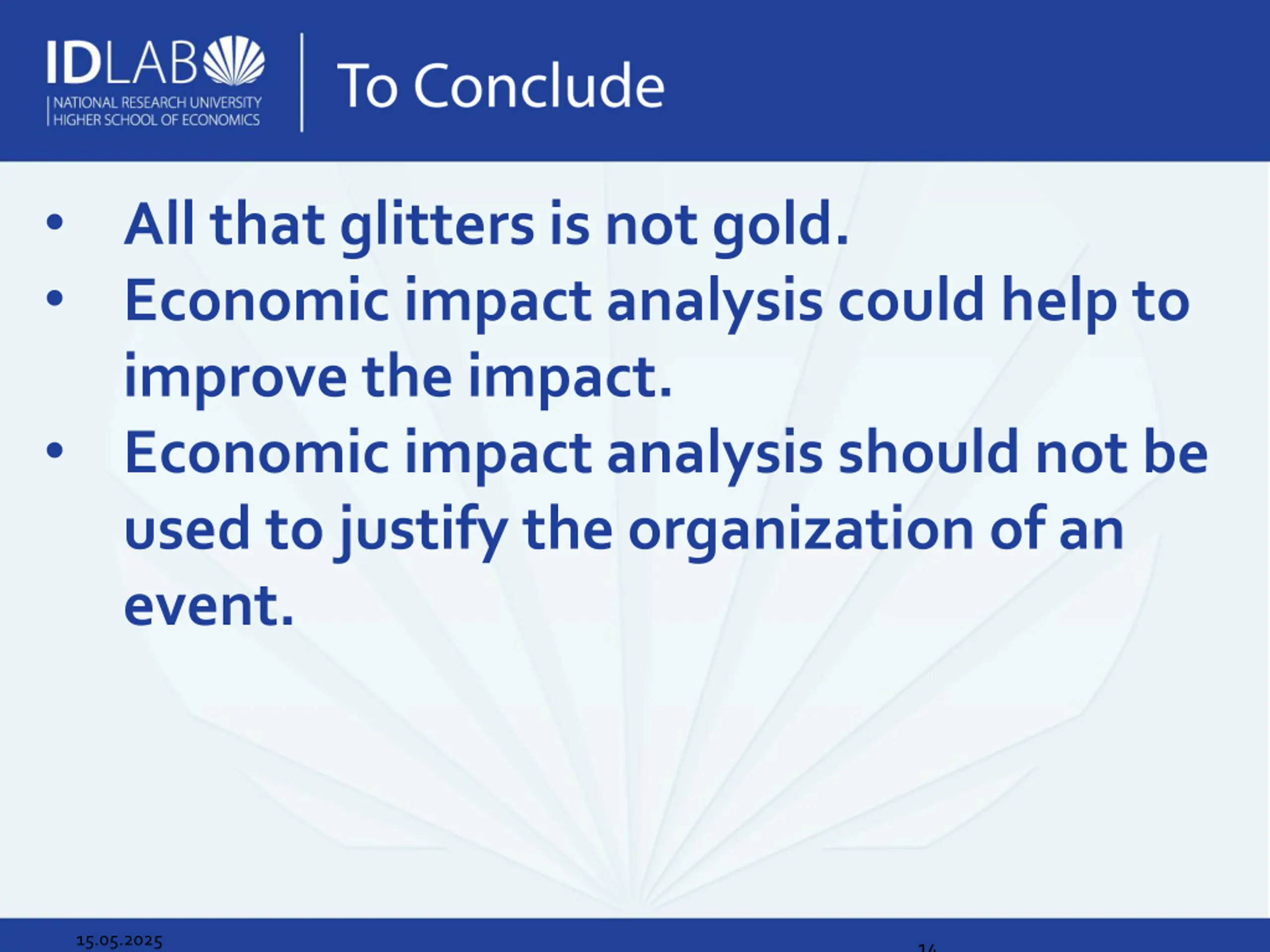 All that glitters is not gold. Economic impact analysis could help to improve the impact. Economic impact analysis should not be used to justify the organization of an event. 15.05.2025 14