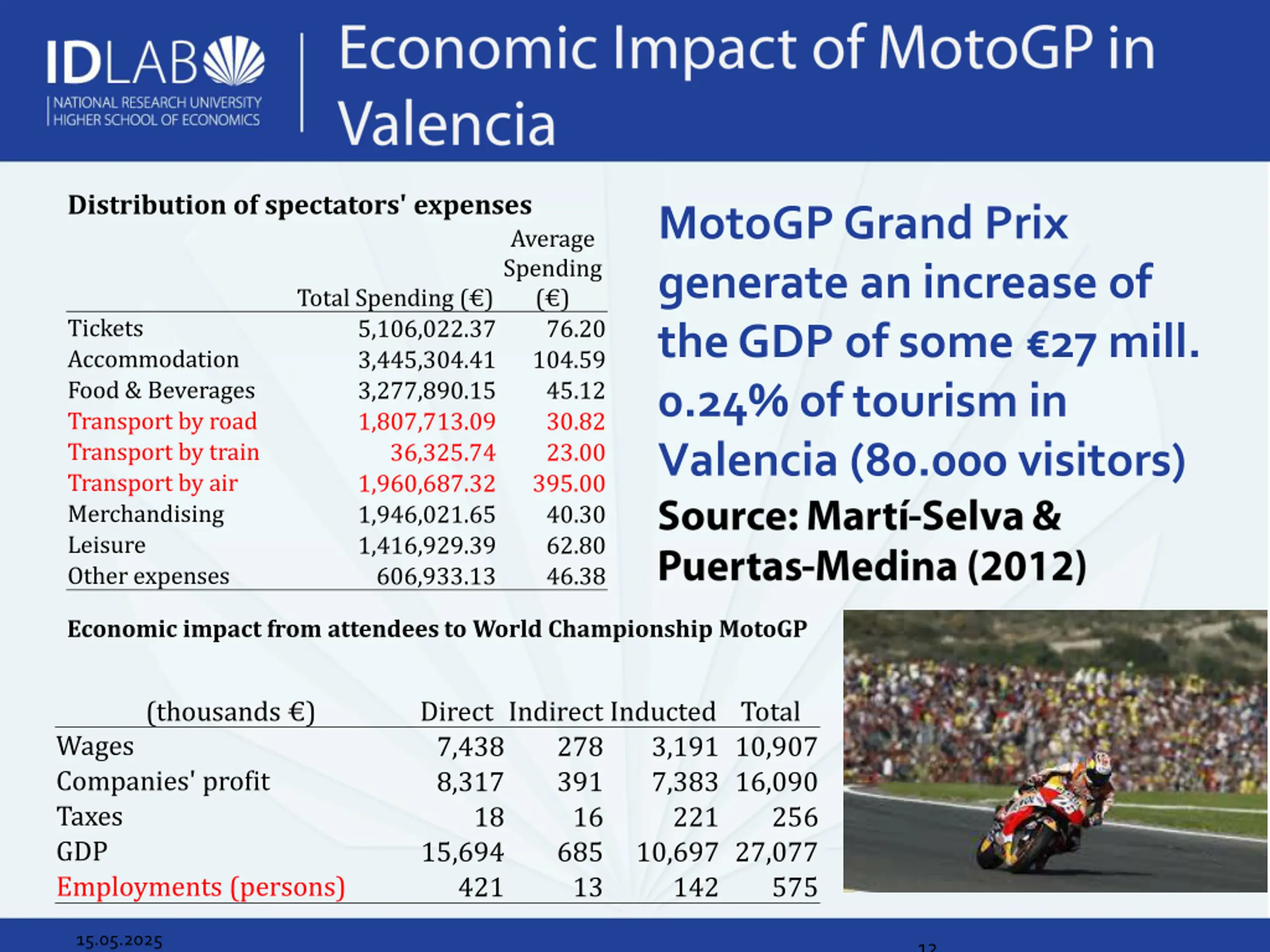 Distribution of spectators' expenses MotoGPGrand Prix generate an increase of the GDP of some 27 mill. 0.24% of tourism in Valencia (80.000 visitors) Average Spending ( ) 76.20 104.59 45.12 30.82 23.00 395.00 40.30 62.80 46.38 Total Spending ( ) 5,106,022.37 3,445,304.41 3,277,890.15 1,807,713.09 36,325.74 1,960,687.32 1,946,021.65 1,416,929.39 606,933.13 Tickets Accommodation Food & Beverages Transport by road Transport by train Transport by air Merchandising Leisure Other expenses Economic impact from attendees to World Championship MotoGP (thousands ) Direct Indirect Inducted Total 7,438 278 8,317 391 18 16 15,694 685 421 13 Wages Companies' profit Taxes GDP Employments (persons) 3,191 10,907 7,383 16,090 221 10,697 27,077 142 256 575 15.05.2025 12