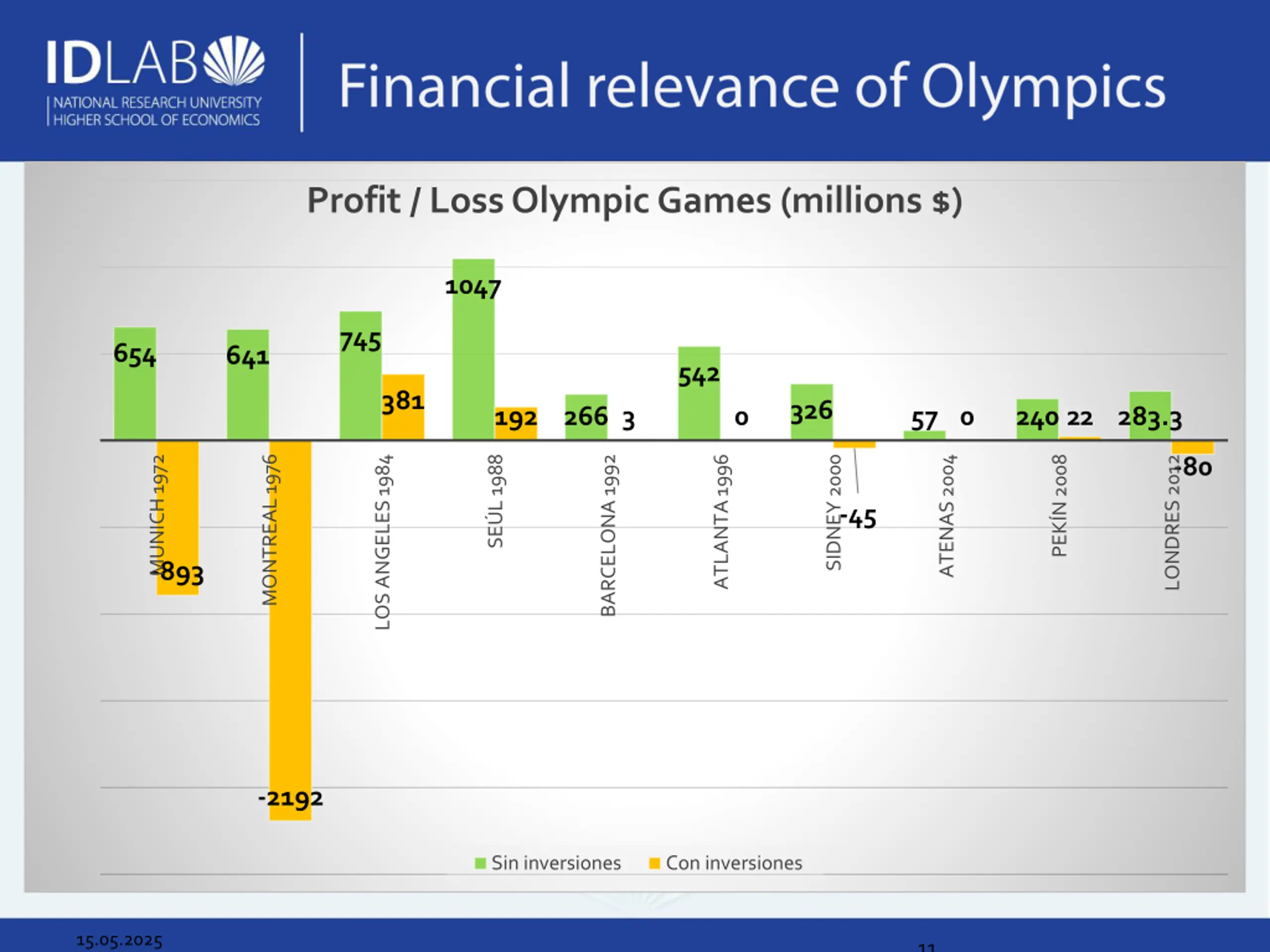 Profit / Loss Olympic Games (millions $) 1047 745 654 641 542 381 326 192 266 3 0 57 0 240 22 283.3 MONTREAL 1976 MUNICH 1972 BARCELONA 1992 SE L 1988 ATLANTA 1996 ATENAS 2004 SIDNEY 2000 PEK N 2008 -80 LONDRES 2012 LOS ANGELES 1984 -45 -893 -2192 Sin inversiones Con inversiones 15.05.2025 11