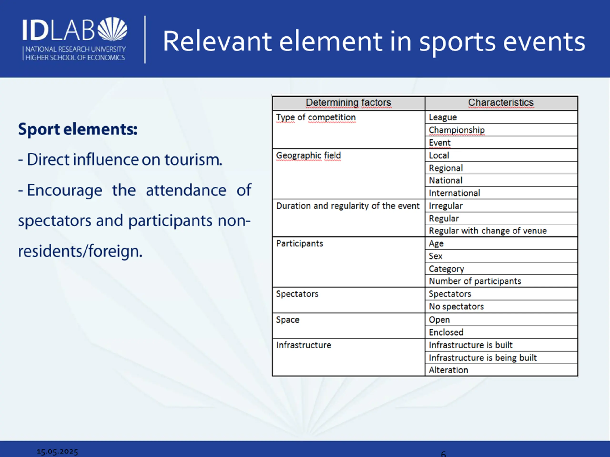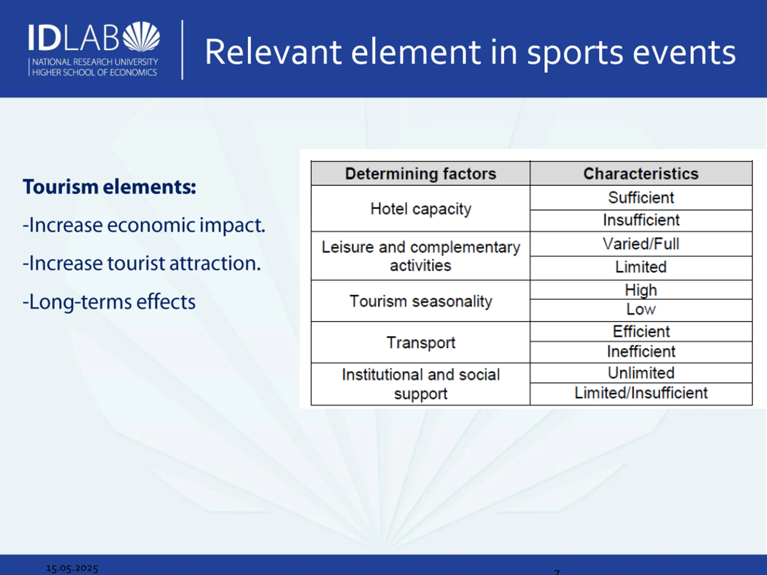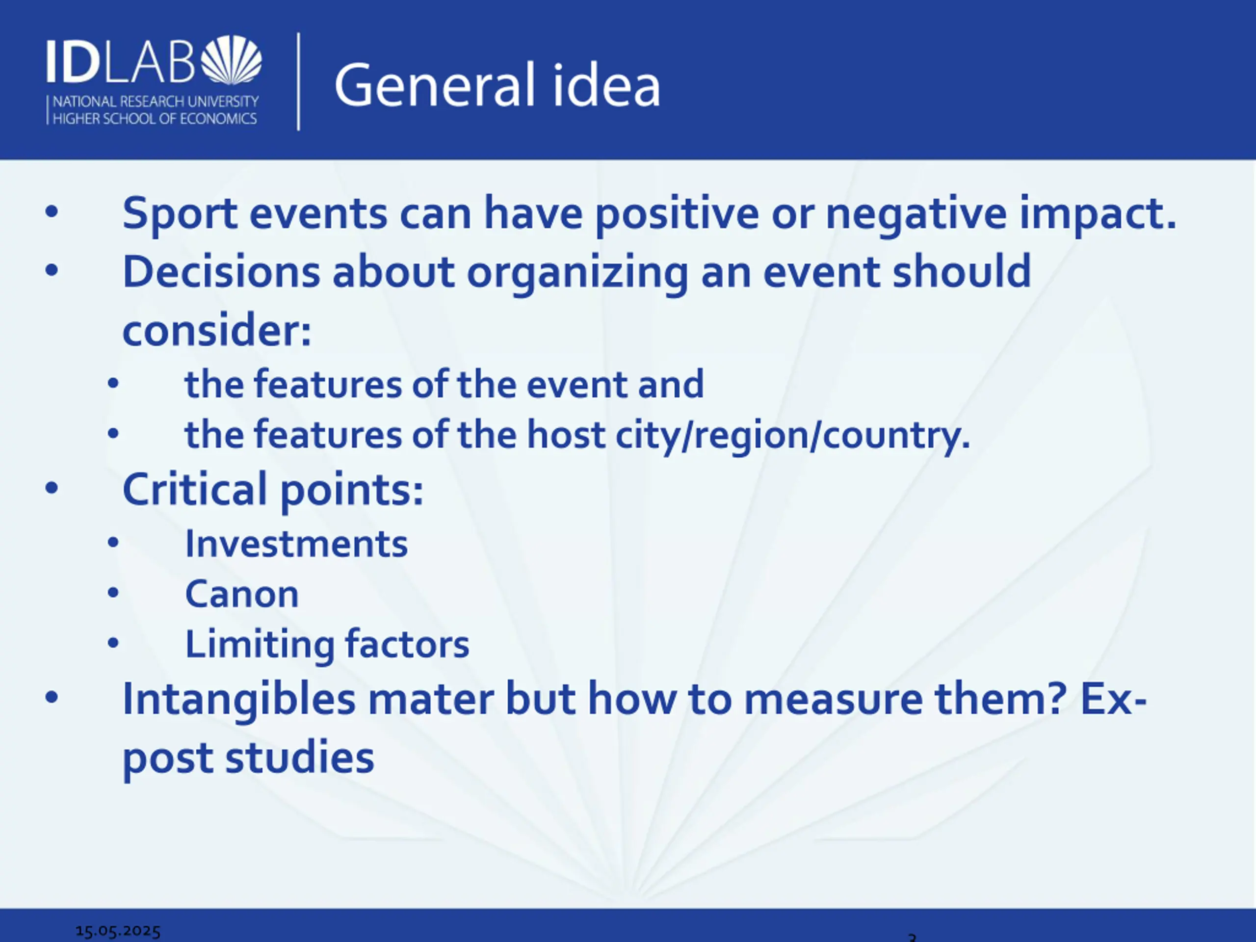 Sport events can have positive or negative impact. Decisions about organizing an event should consider: the features of the event and the features of the host city/region/country. Critical points: Investments Canon Limiting factors Intangibles mater but how to measure them? Ex- post studies 15.05.2025 3