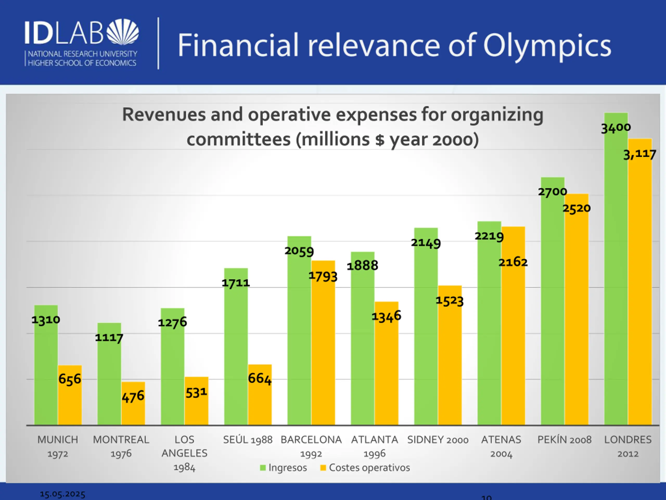 Revenues and operative expenses for organizing committees (millions $ year 2000) 3400 3,117 2700 2520 2219 2149 2059 2162 1888 1793 1711 1523 1346 1310 1276 1117 664 656 531 476 MUNICH 1972 MONTREAL 1976 LOS SE L 1988 BARCELONA ATLANTA 1996 Costes operativos SIDNEY 2000 ATENAS 2004 PEK N 2008 LONDRES 2012 ANGELES 1984 1992 Ingresos 15.05.2025 10