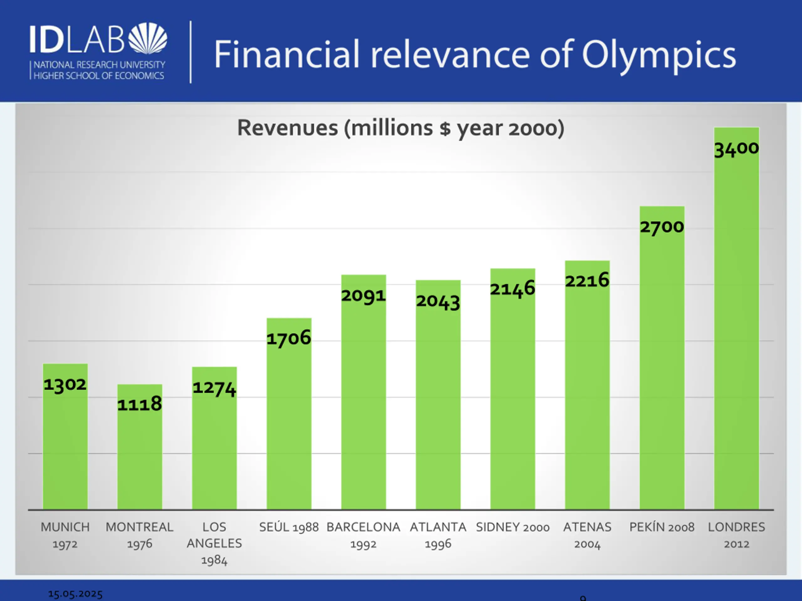 Revenues (millions $ year 2000) 3400 2700 2216 2146 2091 2043 1706 1302 1274 1118 MUNICH 1972 MONTREAL 1976 LOS SE L 1988 BARCELONA ATLANTA 1996 SIDNEY 2000 ATENAS 2004 PEK N 2008 LONDRES 2012 ANGELES 1984 1992 15.05.2025 9