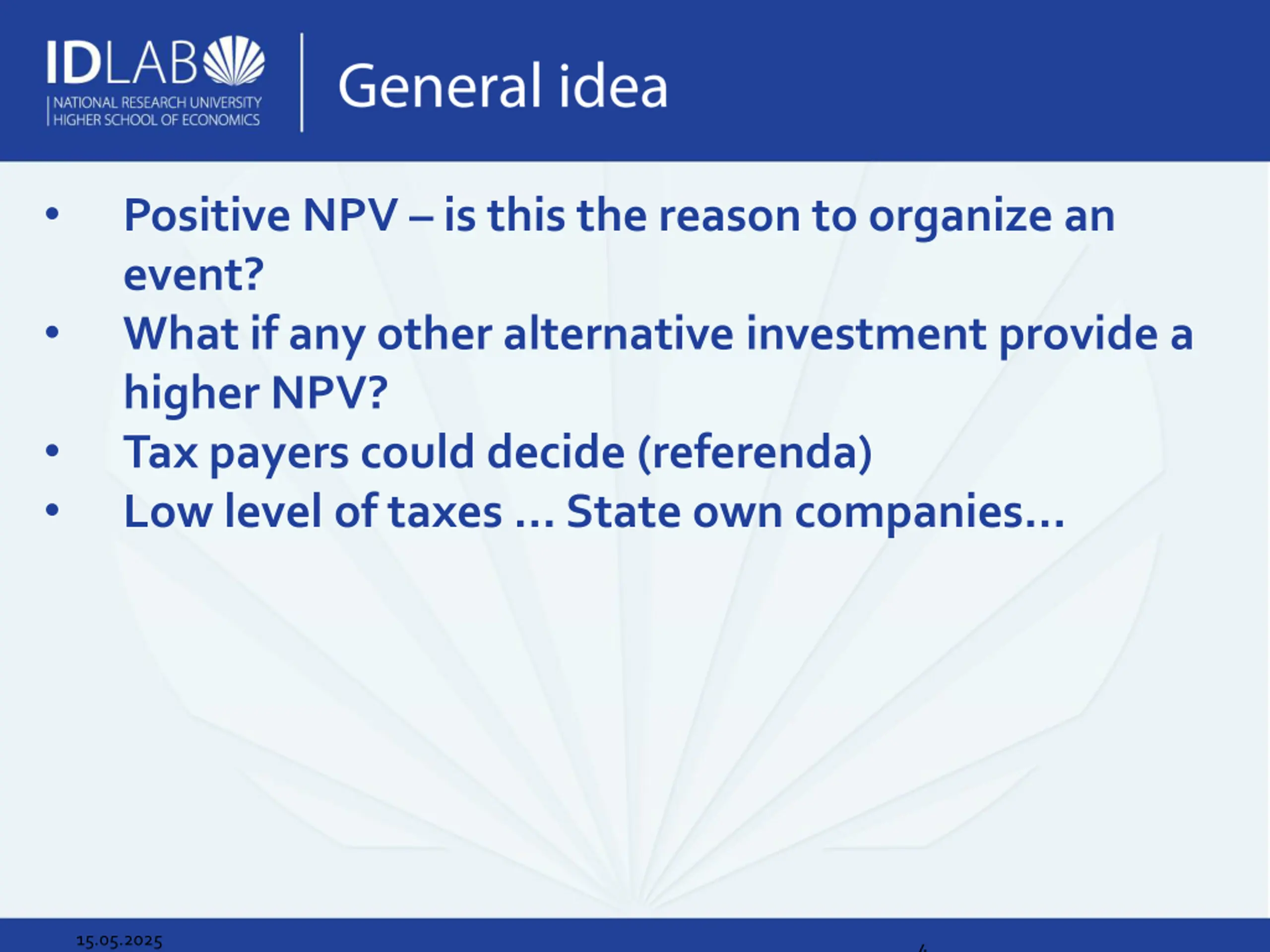 Positive NPV is this the reason to organize an event? What if any other alternative investment provide a higher NPV? Tax payers could decide (referenda) Low level of taxes State own companies 15.05.2025 4