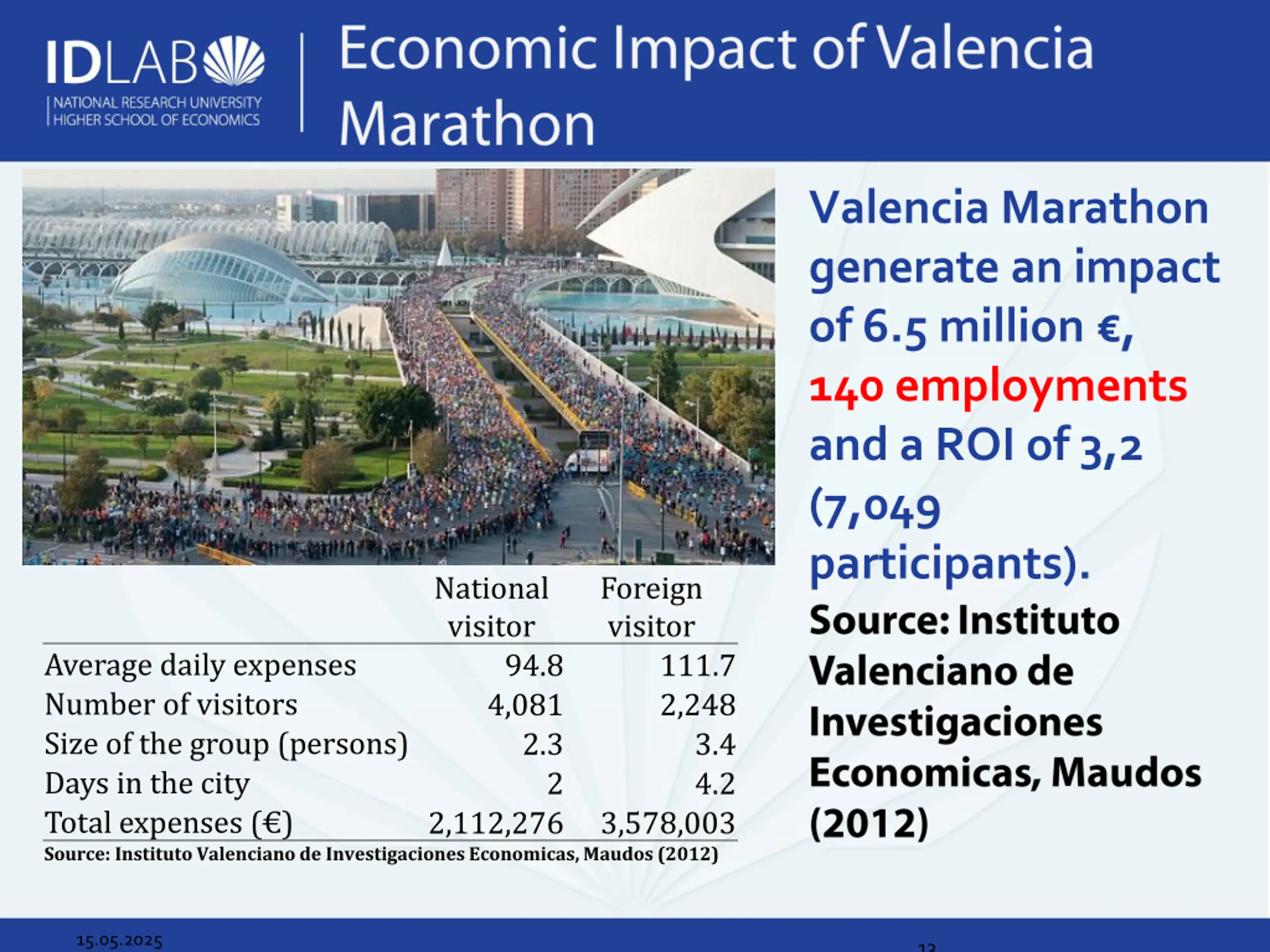 Valencia Marathon generate an impact of 6.5 million , 140 employments and a ROI of 3,2 (7,049 participants). National visitor Foreign visitor Average daily expenses Number of visitors Size of the group (persons) Days in the city Total expenses ( ) Source: Instituto Valenciano de Investigaciones Economicas, Maudos (2012) 94.8 4,081 2.3 111.7 2,248 3.4 4.2 2 2,112,276 3,578,003 15.05.2025 13