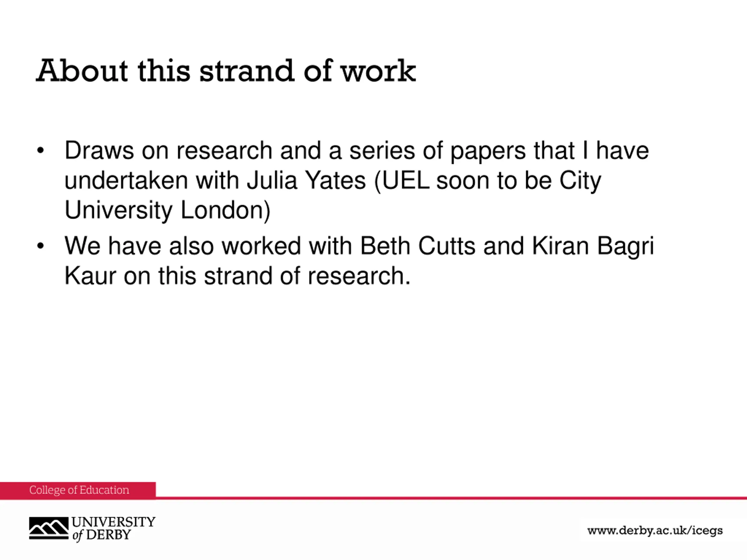 About this strand of work Draws on research and a series of papers that I have undertaken with Julia Yates (UEL soon to be City University London) We have also worked with Beth Cutts and Kiran Bagri Kaur on this strand of research. www.derby.ac.uk www.derby.ac.uk/icegs www.derby.ac.uk/icegs