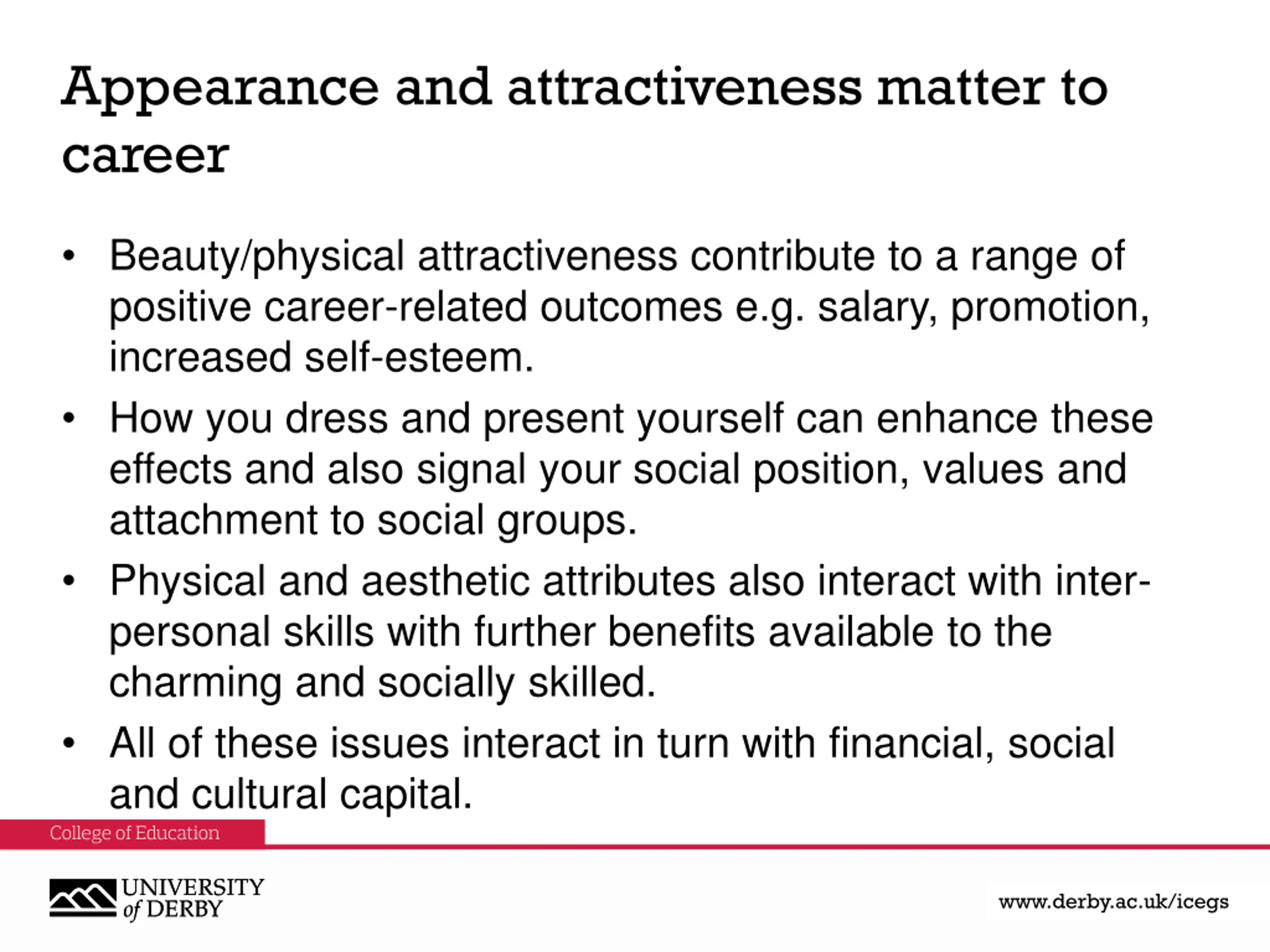 Appearance and attractiveness matter to career Beauty/physical attractiveness contribute to a range of positive career-related outcomes e.g. salary, promotion, increased self-esteem. How you dress and present yourself can enhance these effects and also signal your social position, values and attachment to social groups. Physical and aesthetic attributes also interact with inter- personal skills with further benefits available to the charming and socially skilled. All of these issues interact in turn with financial, social and cultural capital. www.derby.ac.uk www.derby.ac.uk/icegs www.derby.ac.uk/icegs