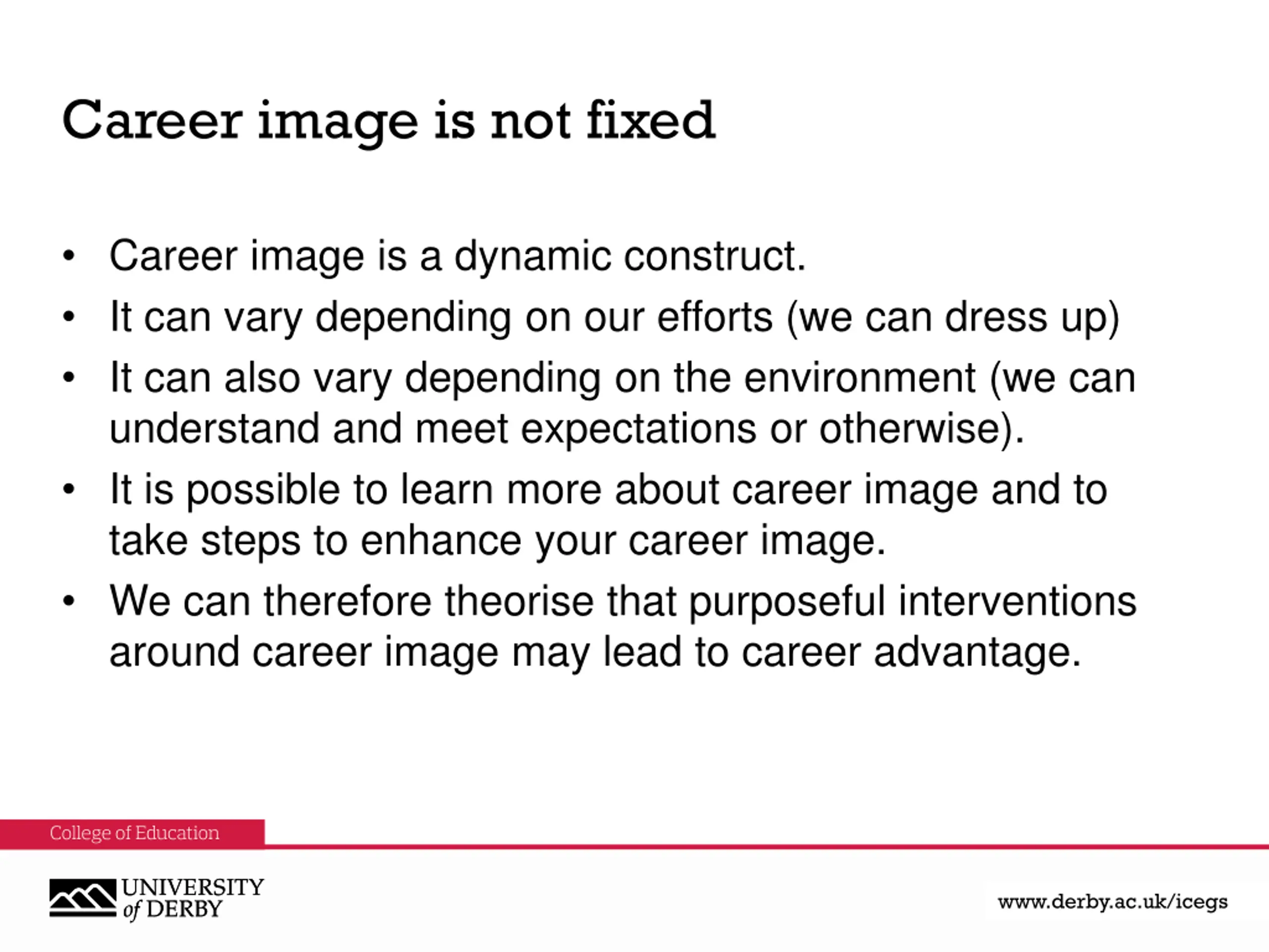 Career image is not fixed Career image is a dynamic construct. It can vary depending on our efforts (we can dress up) It can also vary depending on the environment (we can understand and meet expectations or otherwise). It is possible to learn more about career image and to take steps to enhance your career image. We can therefore theorise that purposeful interventions around career image may lead to career advantage. www.derby.ac.uk www.derby.ac.uk/icegs www.derby.ac.uk/icegs