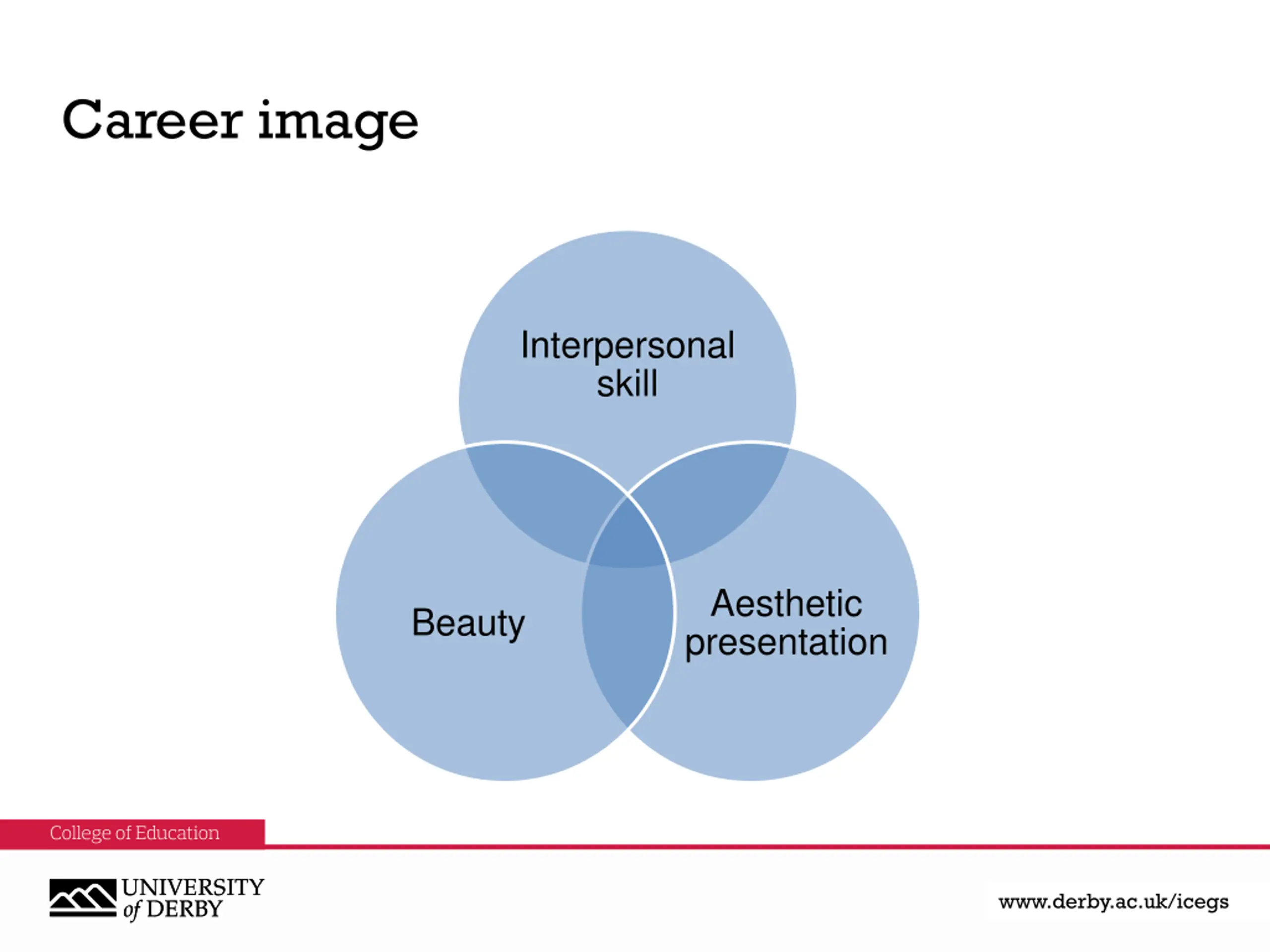 Career image Interpersonal skill Aesthetic presentation Beauty www.derby.ac.uk www.derby.ac.uk/icegs www.derby.ac.uk/icegs