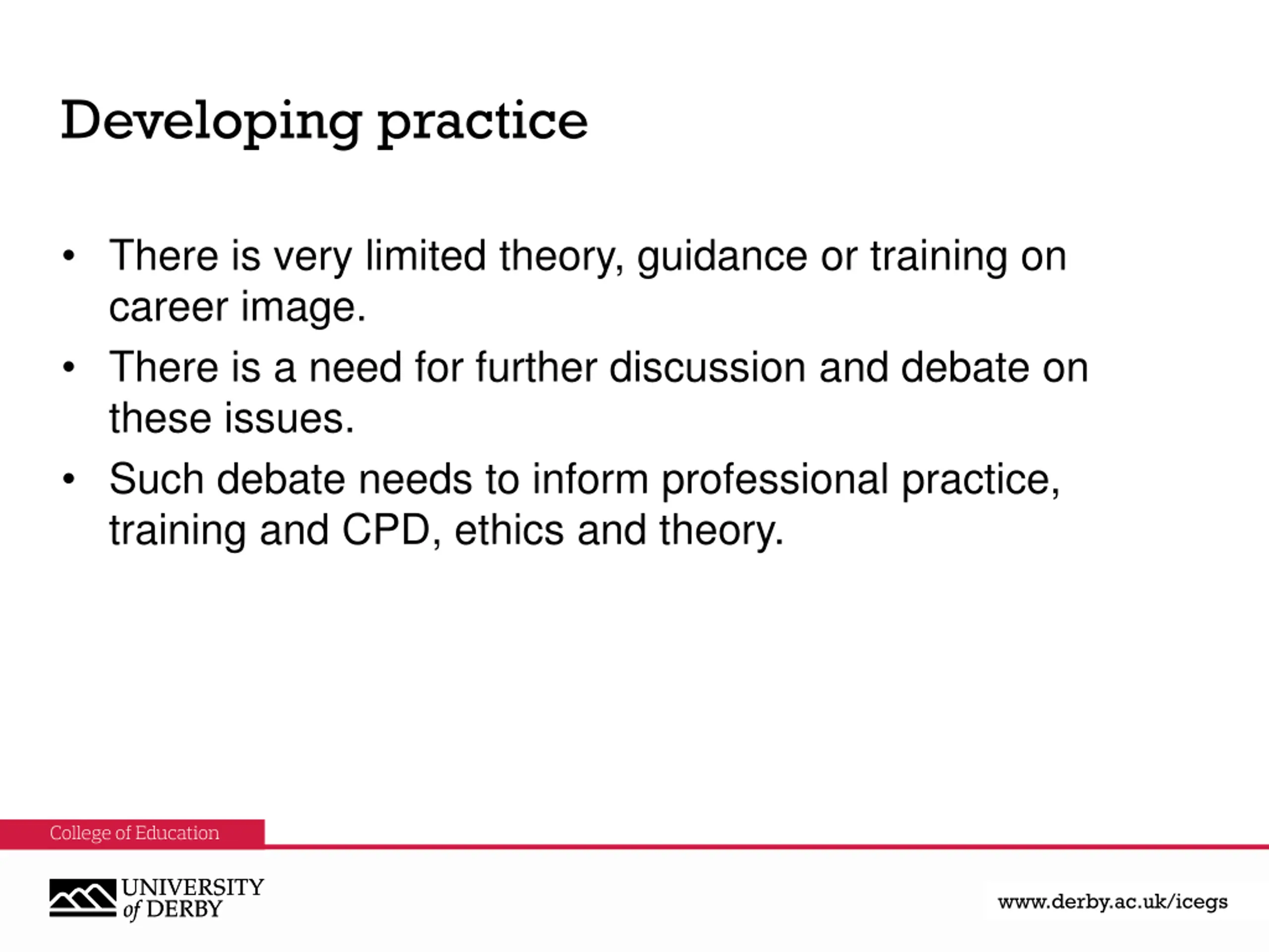 Developing practice There is very limited theory, guidance or training on career image. There is a need for further discussion and debate on these issues. Such debate needs to inform professional practice, training and CPD, ethics and theory. www.derby.ac.uk www.derby.ac.uk/icegs www.derby.ac.uk/icegs