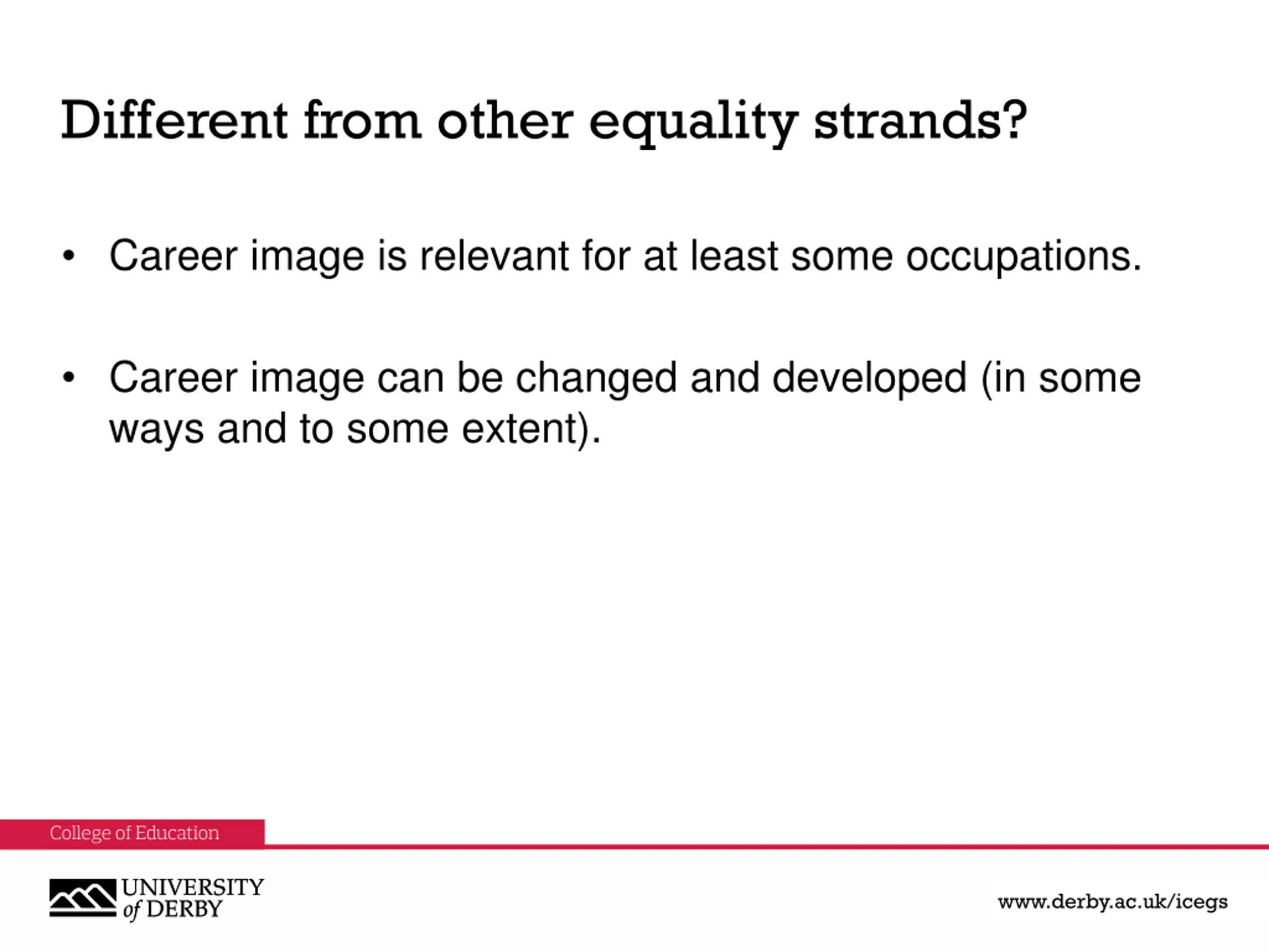 Different from other equality strands? Career image is relevant for at least some occupations. Career image can be changed and developed (in some ways and to some extent). www.derby.ac.uk www.derby.ac.uk/icegs www.derby.ac.uk/icegs