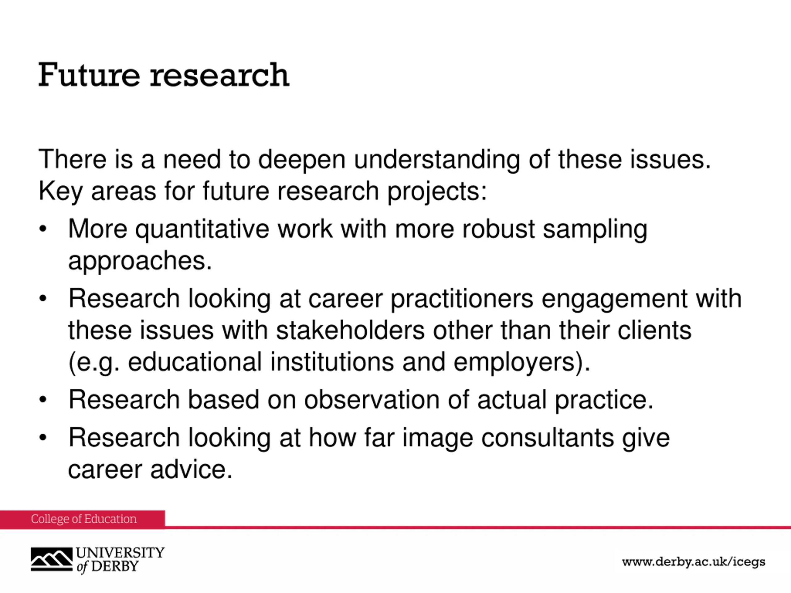 Future research There is a need to deepen understanding of these issues. Key areas for future research projects: More quantitative work with more robust sampling approaches. Research looking at career practitioners engagement with these issues with stakeholders other than their clients (e.g. educational institutions and employers). Research based on observation of actual practice. Research looking at how far image consultants give career advice. www.derby.ac.uk www.derby.ac.uk/icegs www.derby.ac.uk/icegs