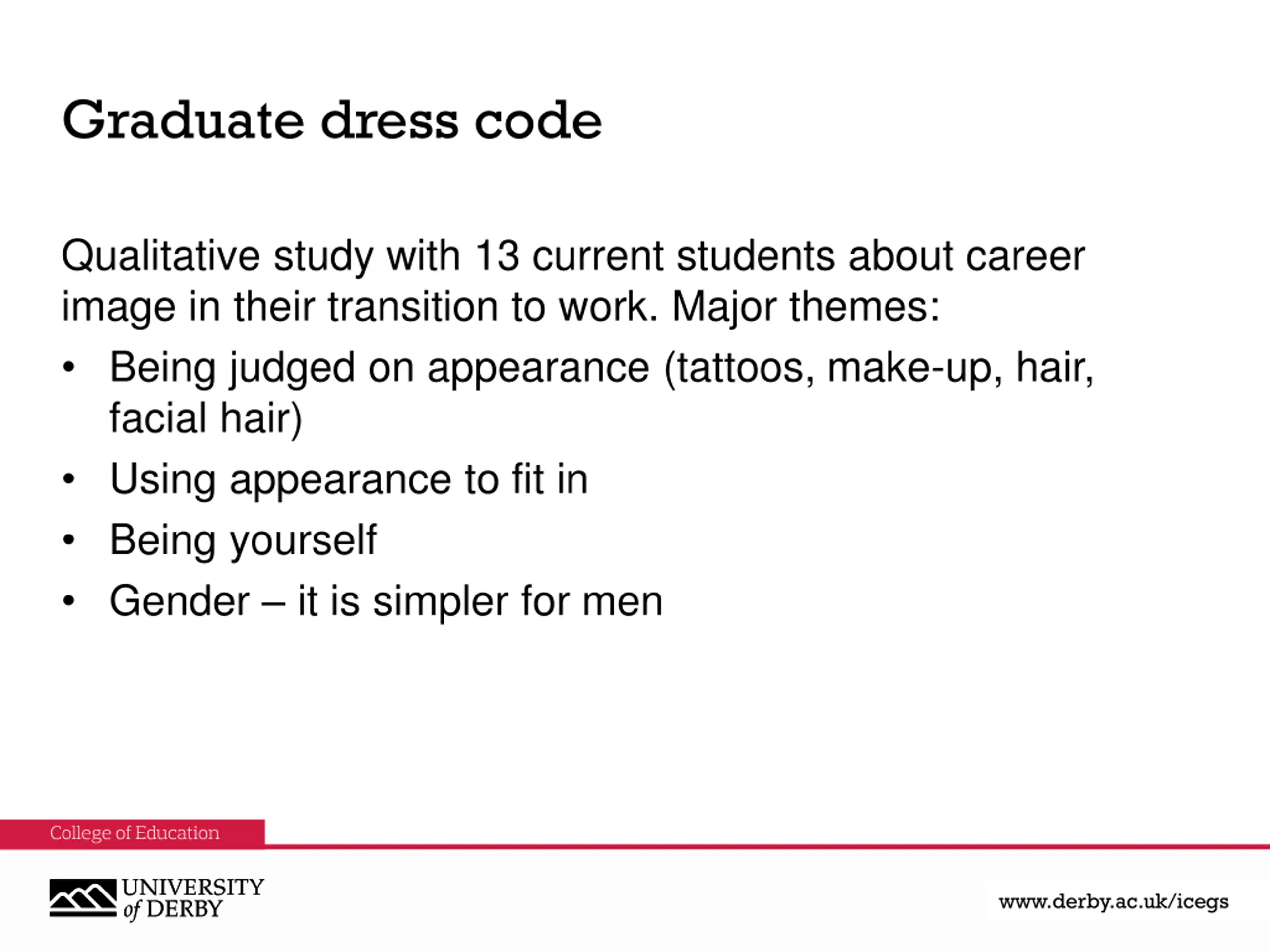 Graduate dress code Qualitative study with 13 current students about career image in their transition to work. Major themes: Being judged on appearance (tattoos, make-up, hair, facial hair) Using appearance to fit in Being yourself Gender it is simpler for men www.derby.ac.uk www.derby.ac.uk/icegs www.derby.ac.uk/icegs