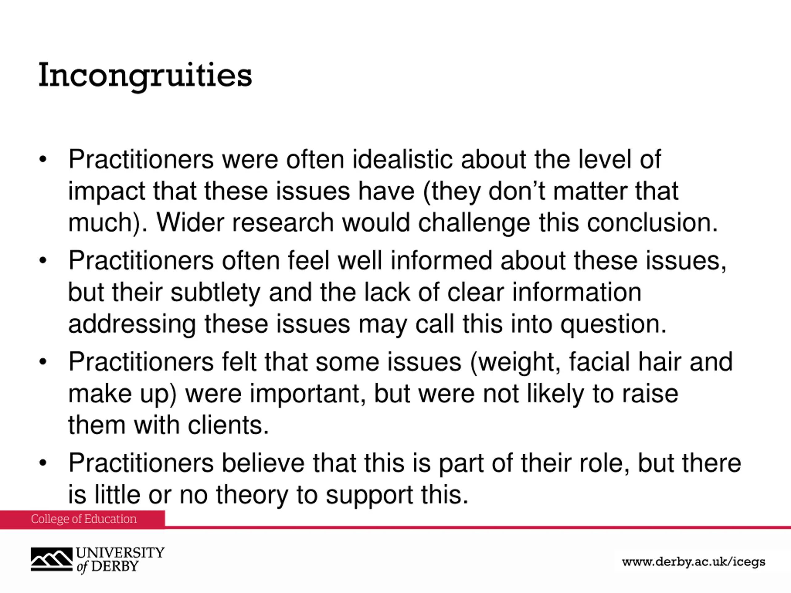 Incongruities Practitioners were often idealistic about the level of impact that these issues have (they don t matter that much). Wider research would challenge this conclusion. Practitioners often feel well informed about these issues, but their subtlety and the lack of clear information addressing these issues may call this into question. Practitioners felt that some issues (weight, facial hair and make up) were important, but were not likely to raise them with clients. Practitioners believe that this is part of their role, but there is little or no theory to support this. www.derby.ac.uk www.derby.ac.uk/icegs www.derby.ac.uk/icegs