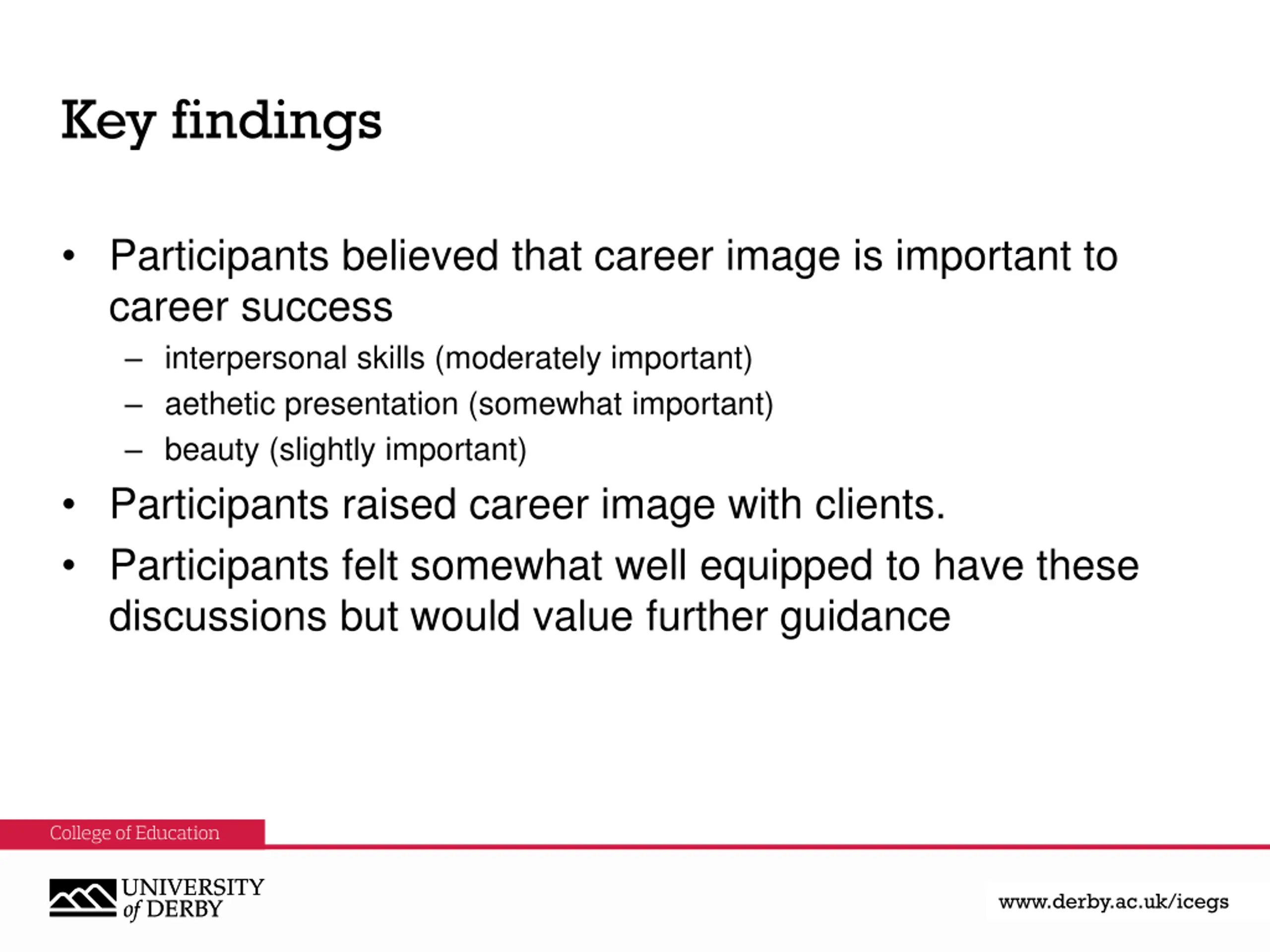 Key findings Participants believed that career image is important to career success interpersonal skills (moderately important) aethetic presentation (somewhat important) beauty (slightly important) Participants raised career image with clients. Participants felt somewhat well equipped to have these discussions but would value further guidance www.derby.ac.uk www.derby.ac.uk/icegs www.derby.ac.uk/icegs