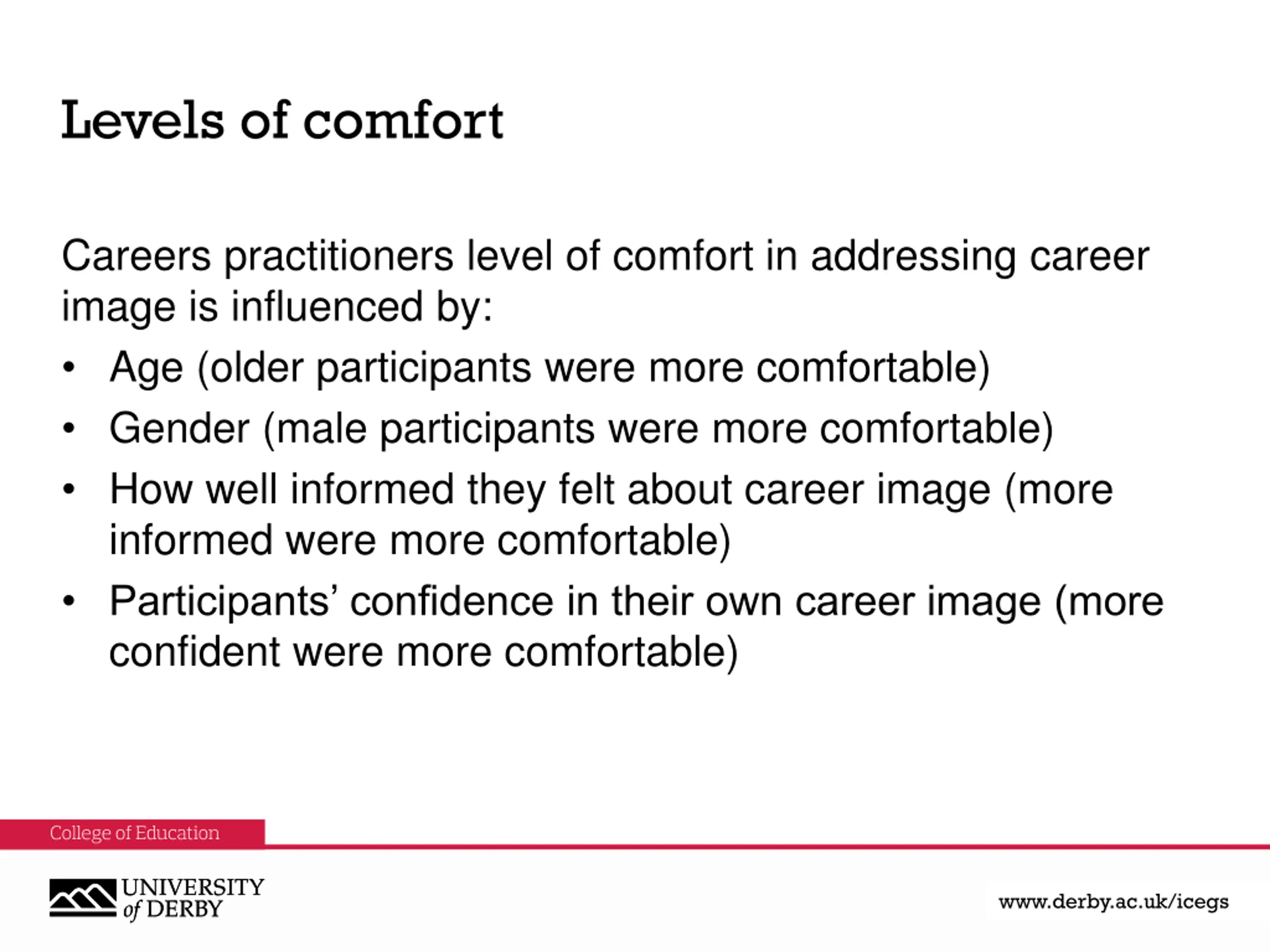 Levels of comfort Careers practitioners level of comfort in addressing career image is influenced by: Age (older participants were more comfortable) Gender (male participants were more comfortable) How well informed they felt about career image (more informed were more comfortable) Participants confidence in their own career image (more confident were more comfortable) www.derby.ac.uk www.derby.ac.uk/icegs www.derby.ac.uk/icegs