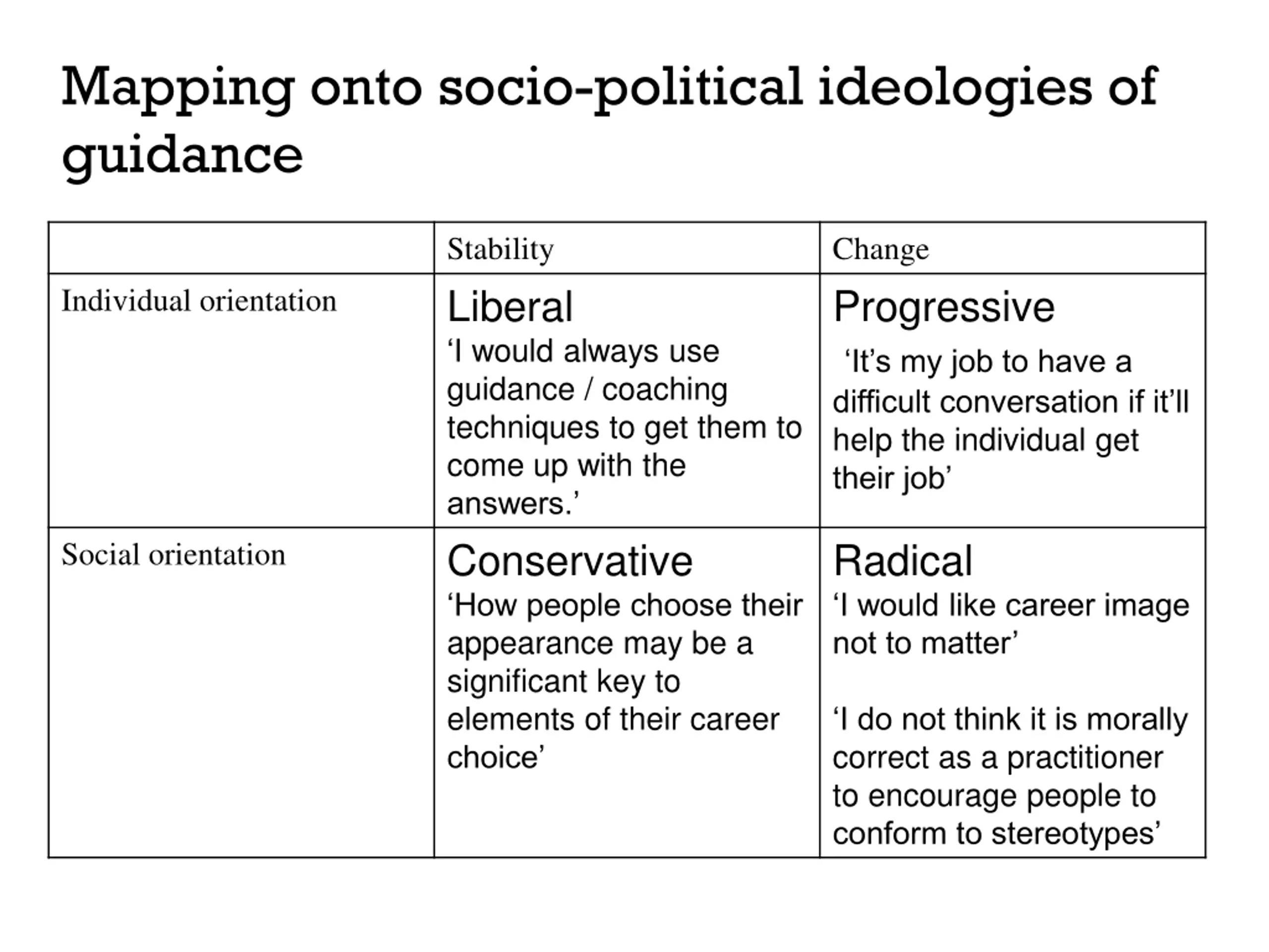 Mapping onto socio-political ideologies of guidance Stability Liberal I would always use guidance / coaching techniques to get them to come up with the answers. Conservative How people choose their appearance may be a significant key to elements of their career choice Change Progressive It s my job to have a difficult conversation if it ll help the individual get their job Individual orientation Radical I would like career image not to matter Social orientation I do not think it is morally correct as a practitioner to encourage people to conform to stereotypes