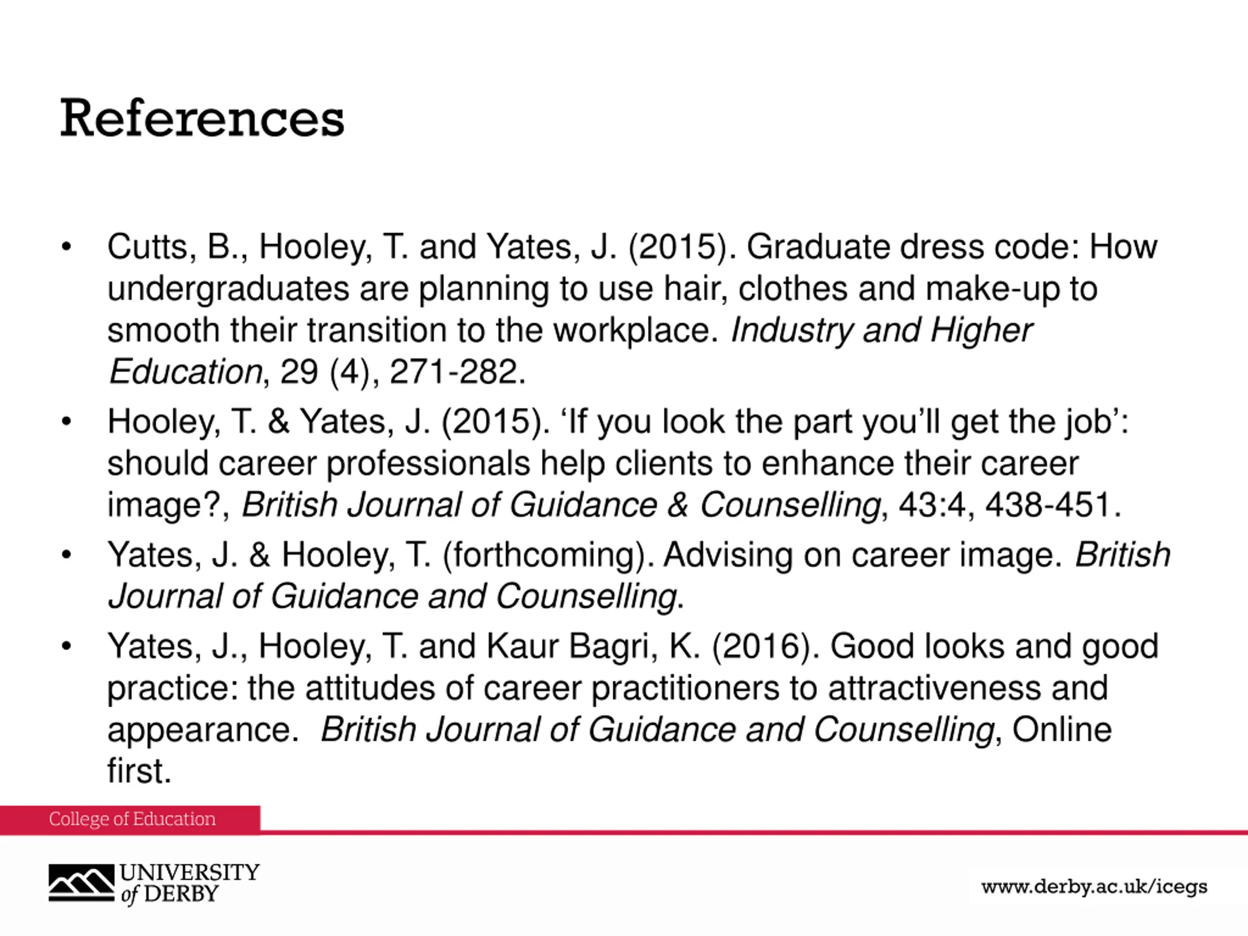 References Cutts, B., Hooley, T. and Yates, J. (2015). Graduate dress code: How undergraduates are planning to use hair, clothes and make-up to smooth their transition to the workplace. Industry and Higher Education, 29 (4), 271-282. Hooley, T. & Yates, J. (2015). If you look the part you ll get the job : should career professionals help clients to enhance their career image?, British Journal of Guidance & Counselling, 43:4, 438-451. Yates, J. & Hooley, T. (forthcoming). Advising on career image. British Journal of Guidance and Counselling. Yates, J., Hooley, T. and Kaur Bagri, K. (2016). Good looks and good practice: the attitudes of career practitioners to attractiveness and appearance. British Journal of Guidance and Counselling, Online first. www.derby.ac.uk www.derby.ac.uk/icegs www.derby.ac.uk/icegs