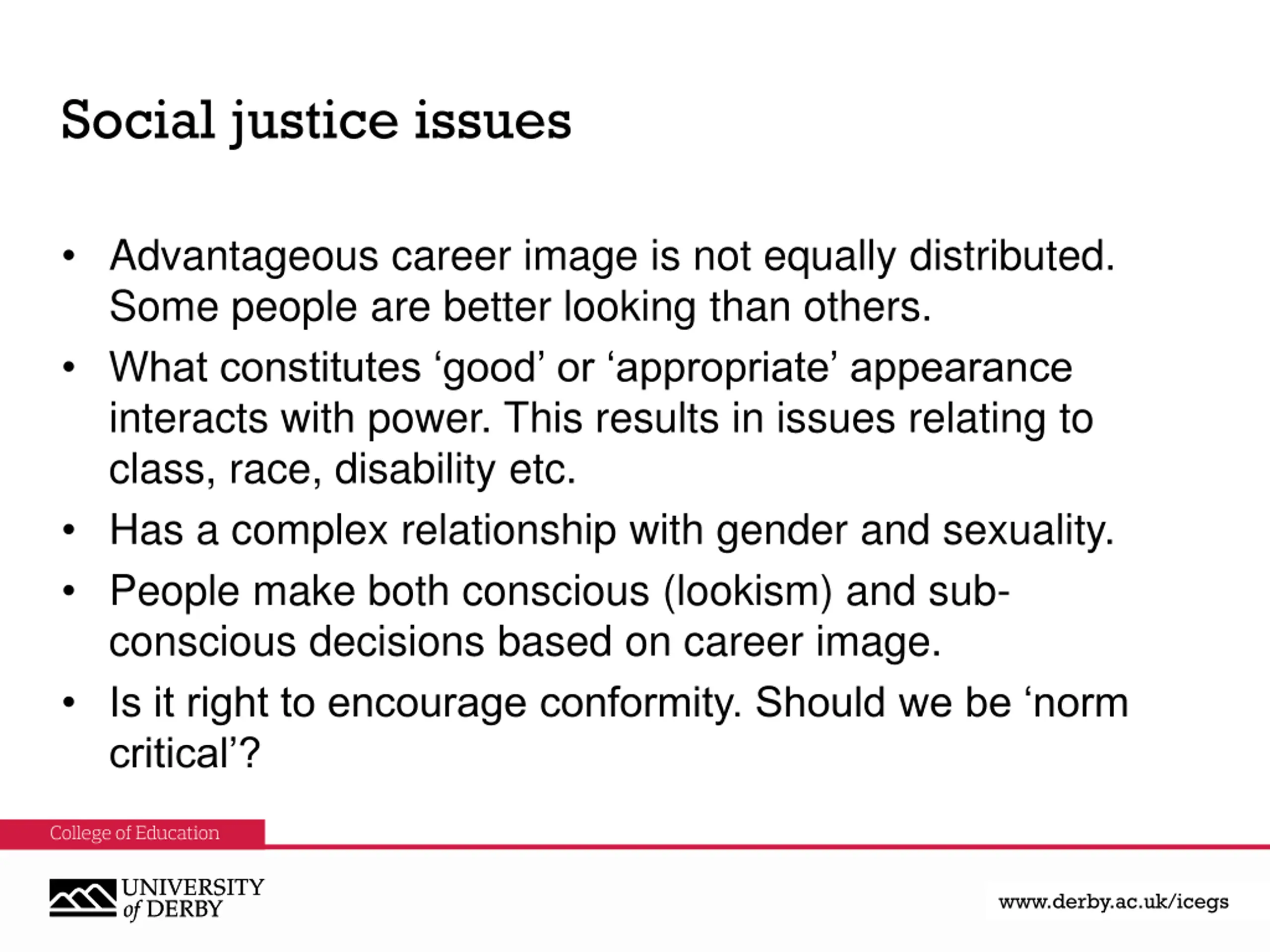 Social justice issues Advantageous career image is not equally distributed. Some people are better looking than others. What constitutes good or appropriate appearance interacts with power. This results in issues relating to class, race, disability etc. Has a complex relationship with gender and sexuality. People make both conscious (lookism) and sub- conscious decisions based on career image. Is it right to encourage conformity. Should we be norm critical ? www.derby.ac.uk www.derby.ac.uk/icegs www.derby.ac.uk/icegs