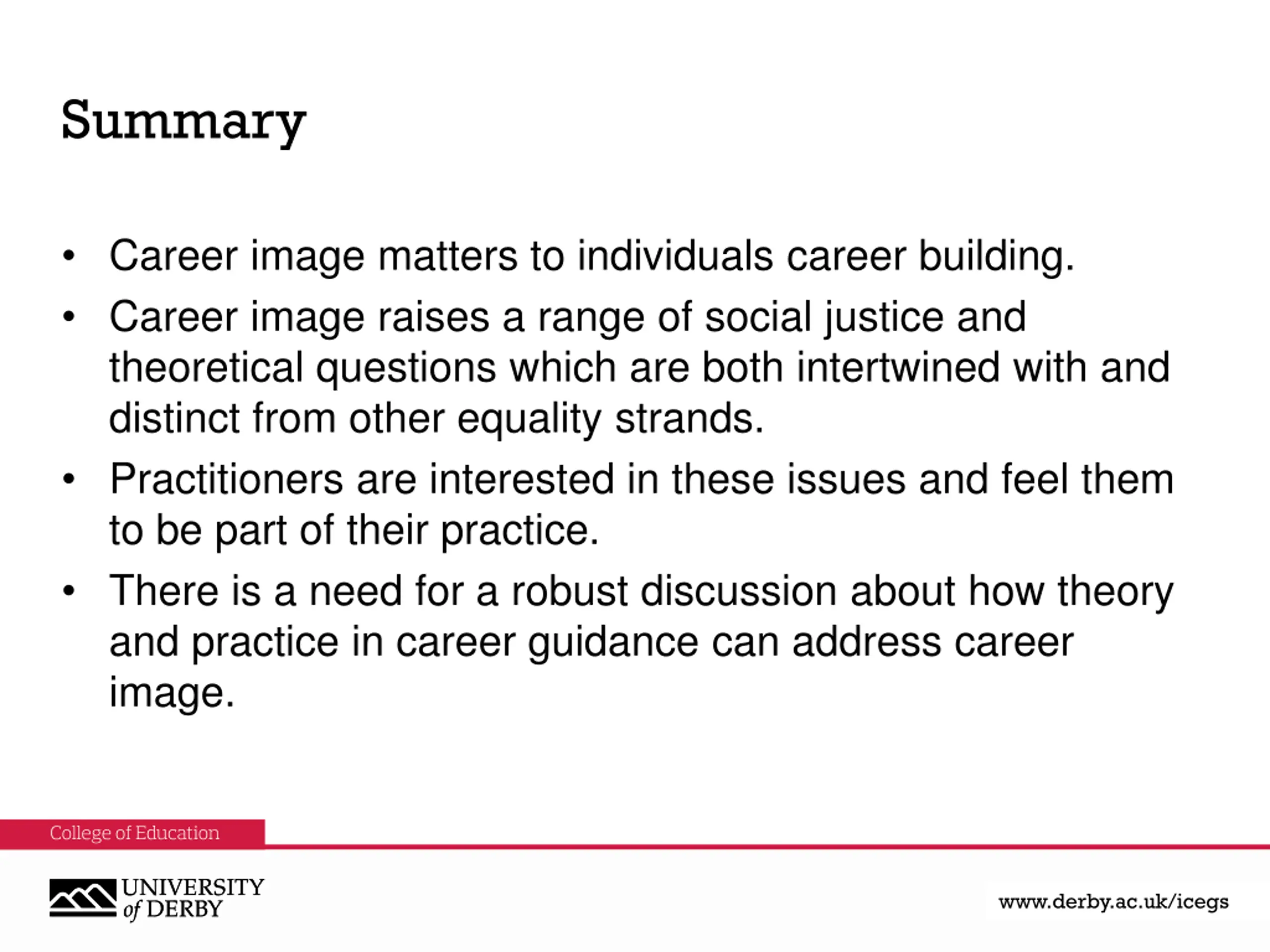 Summary Career image matters to individuals career building. Career image raises a range of social justice and theoretical questions which are both intertwined with and distinct from other equality strands. Practitioners are interested in these issues and feel them to be part of their practice. There is a need for a robust discussion about how theory and practice in career guidance can address career image. www.derby.ac.uk www.derby.ac.uk/icegs www.derby.ac.uk/icegs