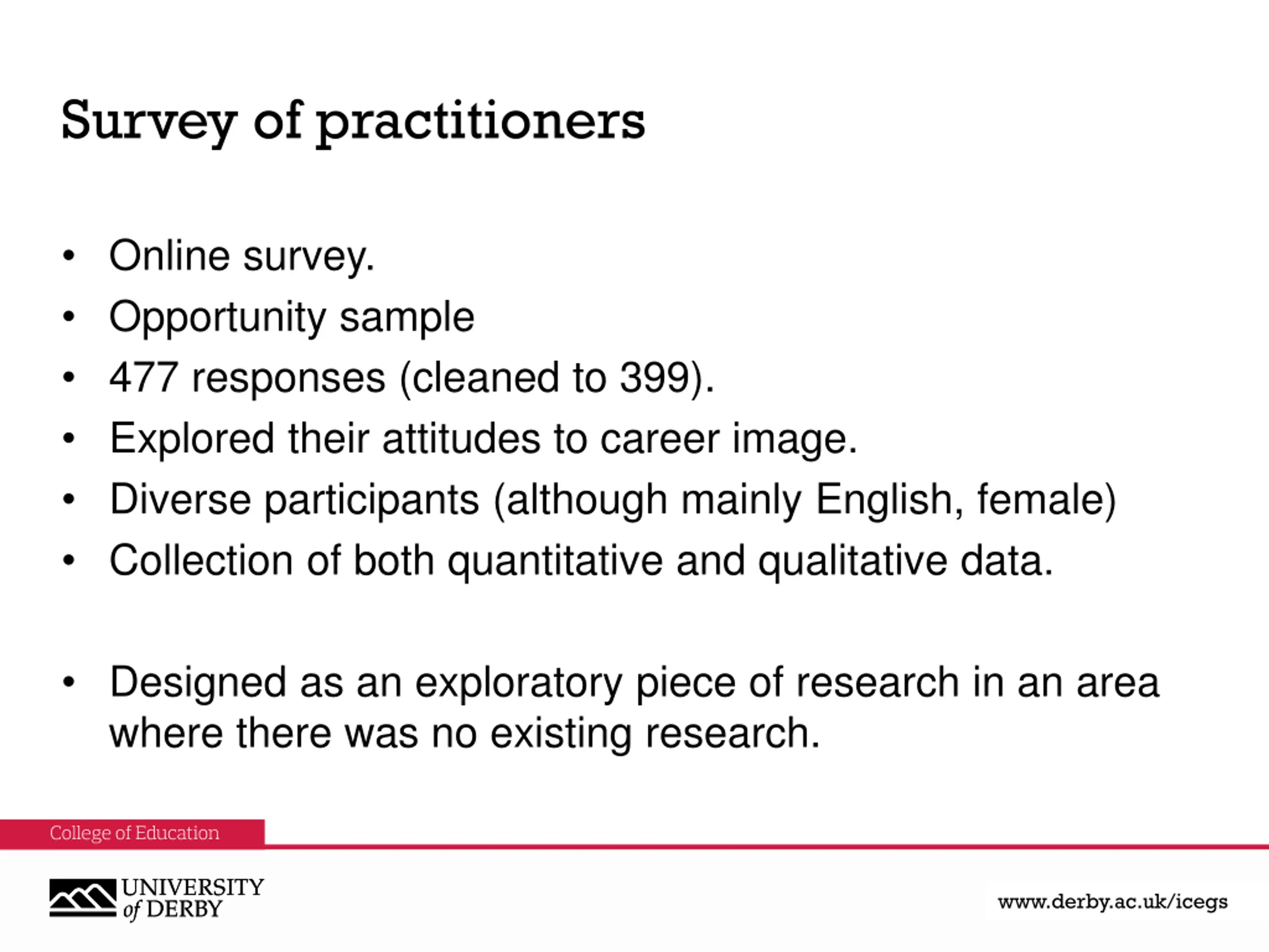Survey of practitioners Online survey. Opportunity sample 477 responses (cleaned to 399). Explored their attitudes to career image. Diverse participants (although mainly English, female) Collection of both quantitative and qualitative data. Designed as an exploratory piece of research in an area where there was no existing research. www.derby.ac.uk www.derby.ac.uk/icegs www.derby.ac.uk/icegs
