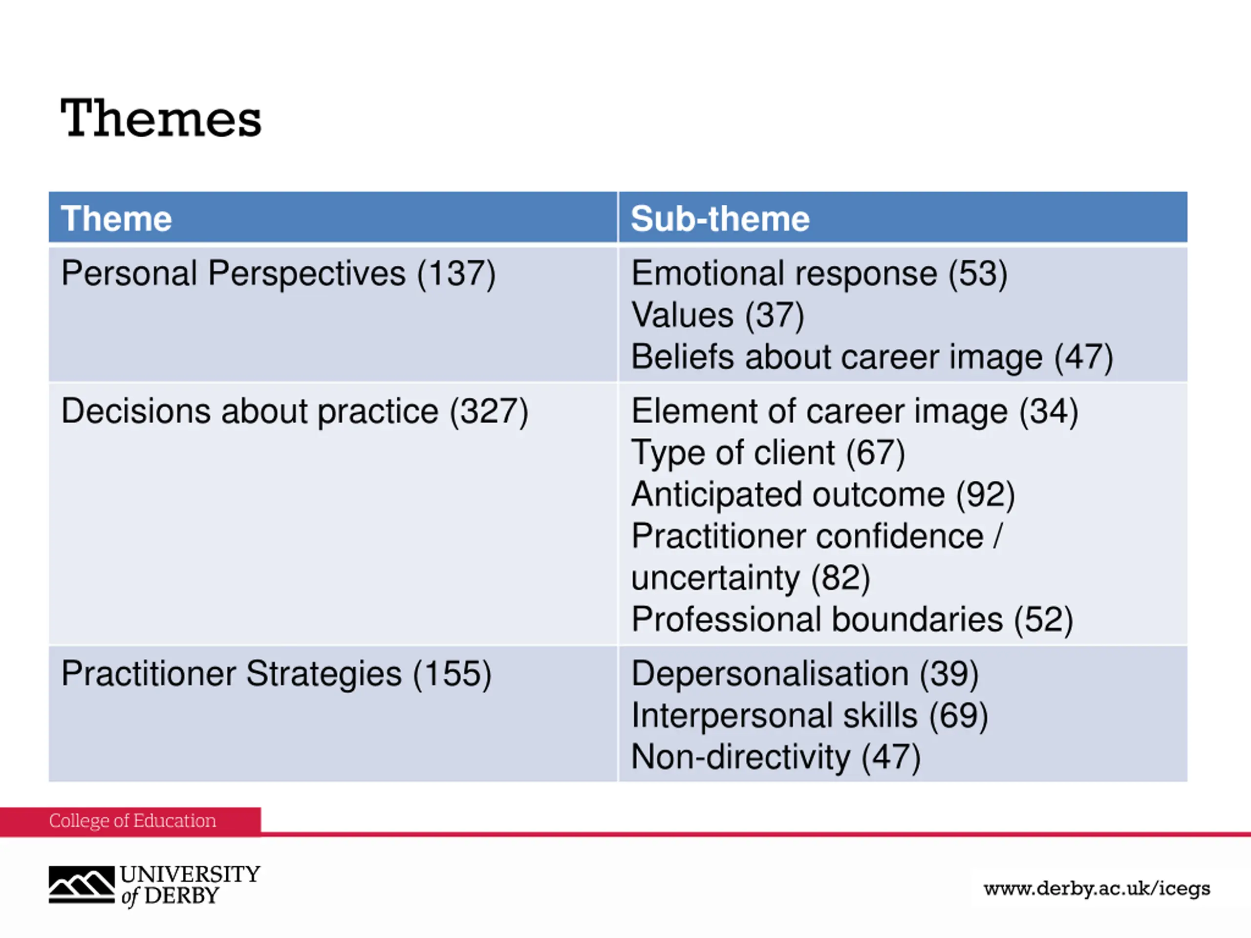 Themes Theme Personal Perspectives (137) Sub-theme Emotional response (53) Values (37) Beliefs about career image (47) Element of career image (34) Type of client (67) Anticipated outcome (92) Practitioner confidence / uncertainty (82) Professional boundaries (52) Depersonalisation (39) Interpersonal skills (69) Non-directivity (47) Decisions about practice (327) Practitioner Strategies (155) www.derby.ac.uk www.derby.ac.uk/icegs www.derby.ac.uk/icegs