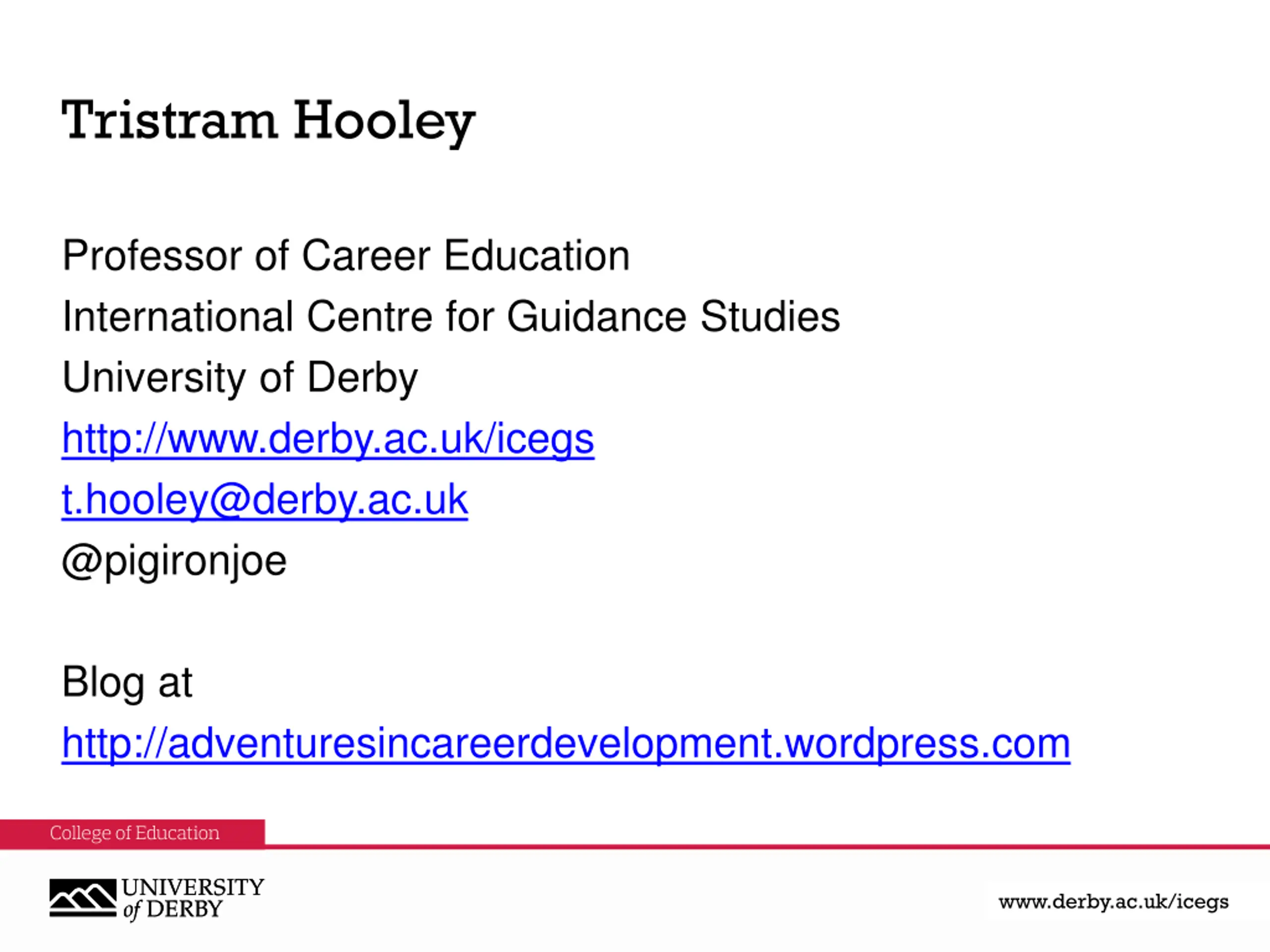 Tristram Hooley Professor of Career Education International Centre for Guidance Studies University of Derby http://www.derby.ac.uk/icegs t.hooley@derby.ac.uk @pigironjoe Blog at http://adventuresincareerdevelopment.wordpress.com www.derby.ac.uk www.derby.ac.uk/icegs www.derby.ac.uk/icegs