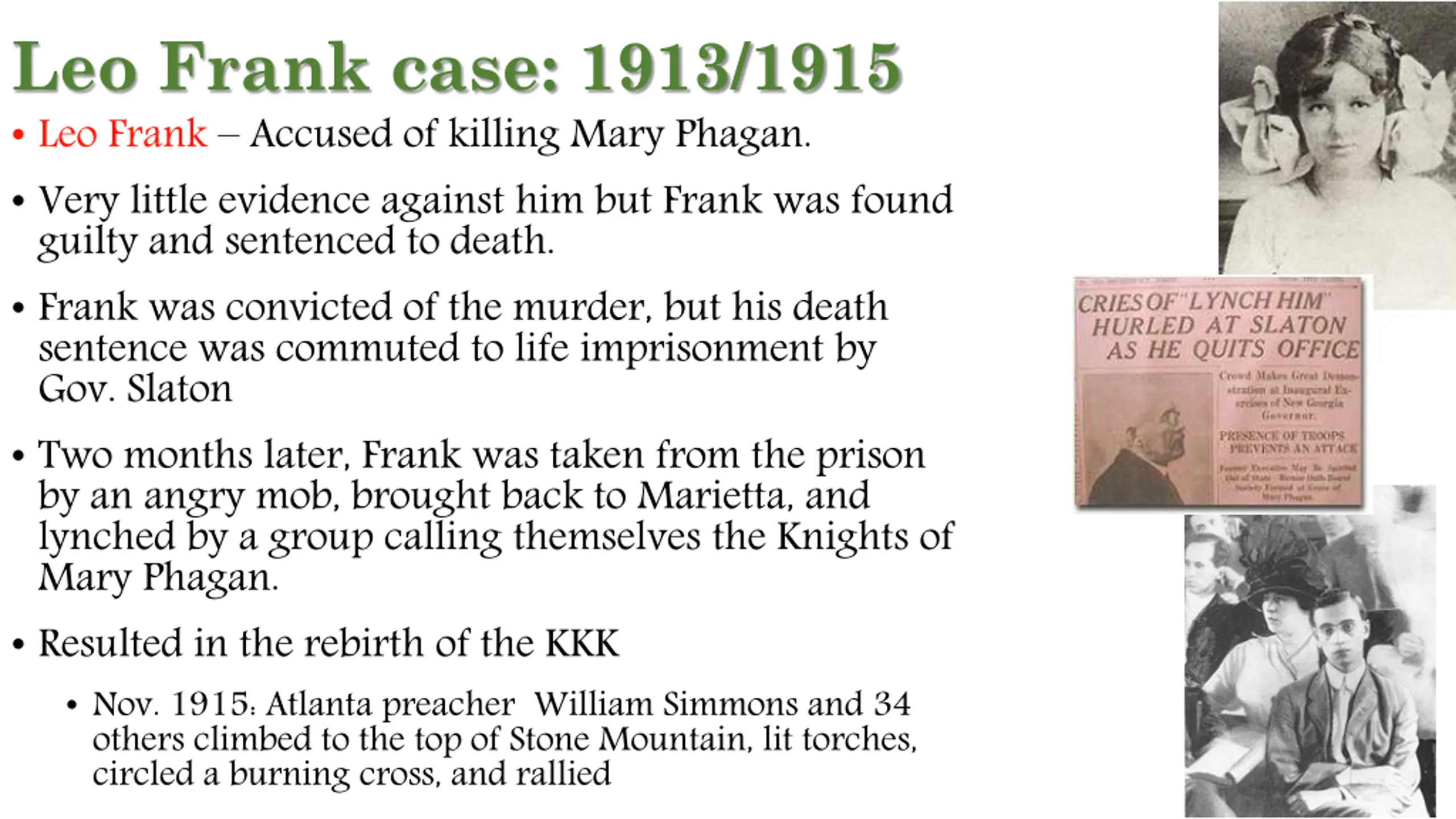 150px-Mary_Phagan Leo Frank case: 1913/1915 Leo Frank Accused of killing Mary Phagan. Very little evidence against him but Frank was found guilty and sentenced to death. Frank was convicted of the murder, but his death sentence was commuted to life imprisonment by Gov. Slaton Two months later, Frank was taken from the prison by an angry mob, brought back to Marietta, and lynched by a group calling themselves the Knights of Mary Phagan. Resulted in the rebirth of the KKK Nov. 1915: Atlanta preacher William Simmons and 34 others climbed to the top of Stone Mountain, lit torches, circled a burning cross, and rallied 220px-Leo-frank-slaton-headline 220px-Leo-frank-at-trial