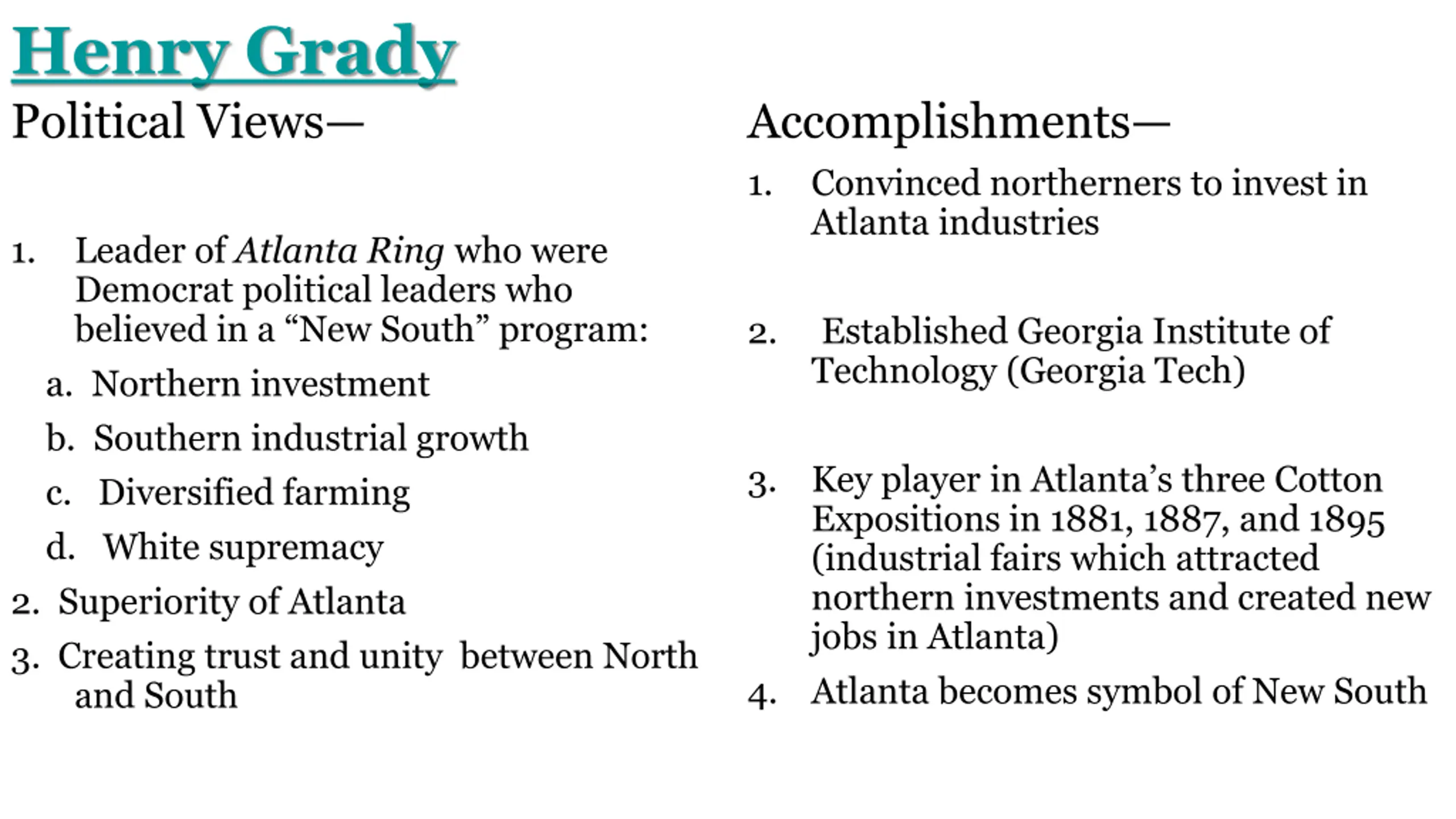 Henry Grady Political Views Accomplishments 1. Convinced northerners to invest in Atlanta industries 1. Leader of Atlanta Ring who were Democrat political leaders who believed in a New South program: a. Northern investment b. Southern industrial growth c. Diversified farming d. White supremacy 2. Superiority of Atlanta 3. Creating trust and unity between North and South 2. Established Georgia Institute of Technology (Georgia Tech) 3. Key player in Atlanta s three Cotton Expositions in 1881, 1887, and 1895 (industrial fairs which attracted northern investments and created new jobs in Atlanta) Atlanta becomes symbol of New South 4.