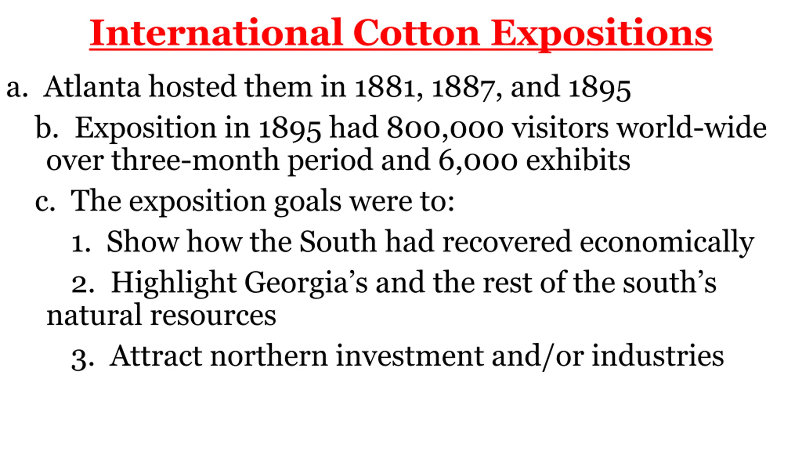 International Cotton Expositions a. Atlanta hosted them in 1881, 1887, and 1895 b. Exposition in 1895 had 800,000 visitors world-wide over three-month period and 6,000 exhibits c. The exposition goals were to: 1. Show how the South had recovered economically 2. Highlight Georgia s and the rest of the south s natural resources 3. Attract northern investment and/or industries