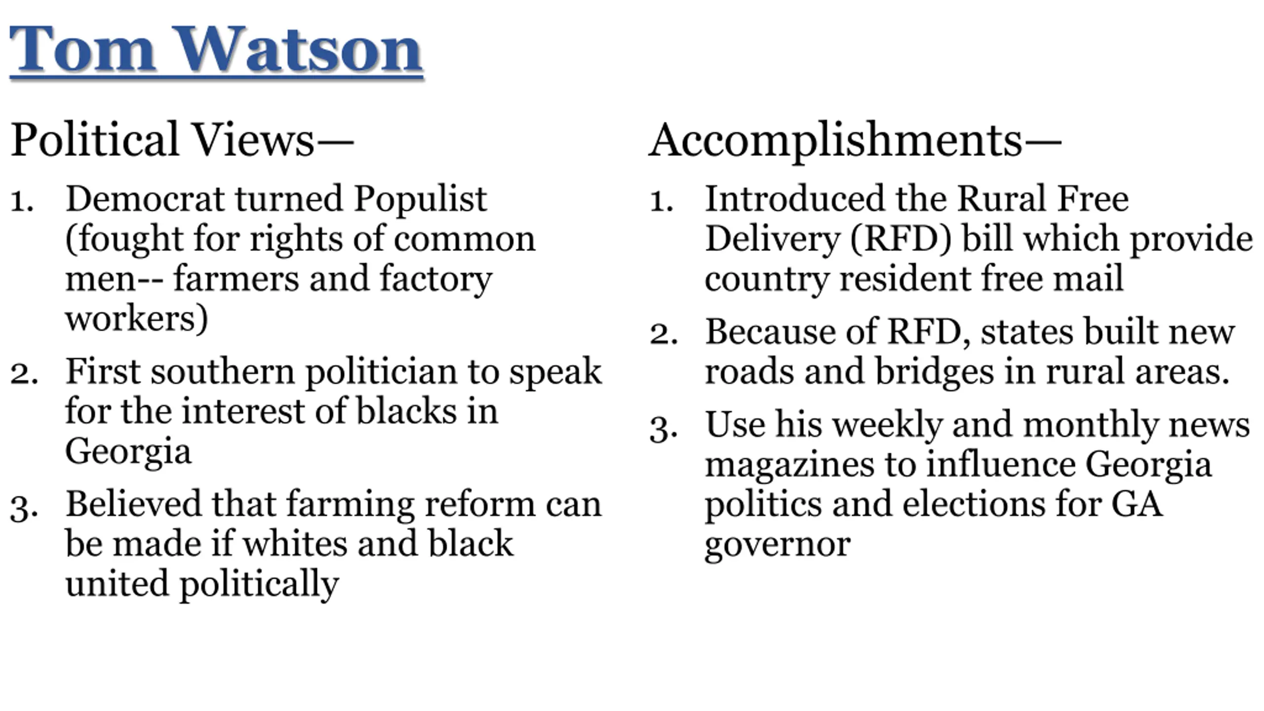 Tom Watson Political Views 1. Democrat turned Populist (fought for rights of common men-- farmers and factory workers) 2. First southern politician to speak for the interest of blacks in Georgia 3. Believed that farming reform can be made if whites and black united politically Accomplishments 1. Introduced the Rural Free Delivery (RFD) bill which provide country resident free mail 2. Because of RFD, states built new roads and bridges in rural areas. 3. Use his weekly and monthly news magazines to influence Georgia politics and elections for GA governor