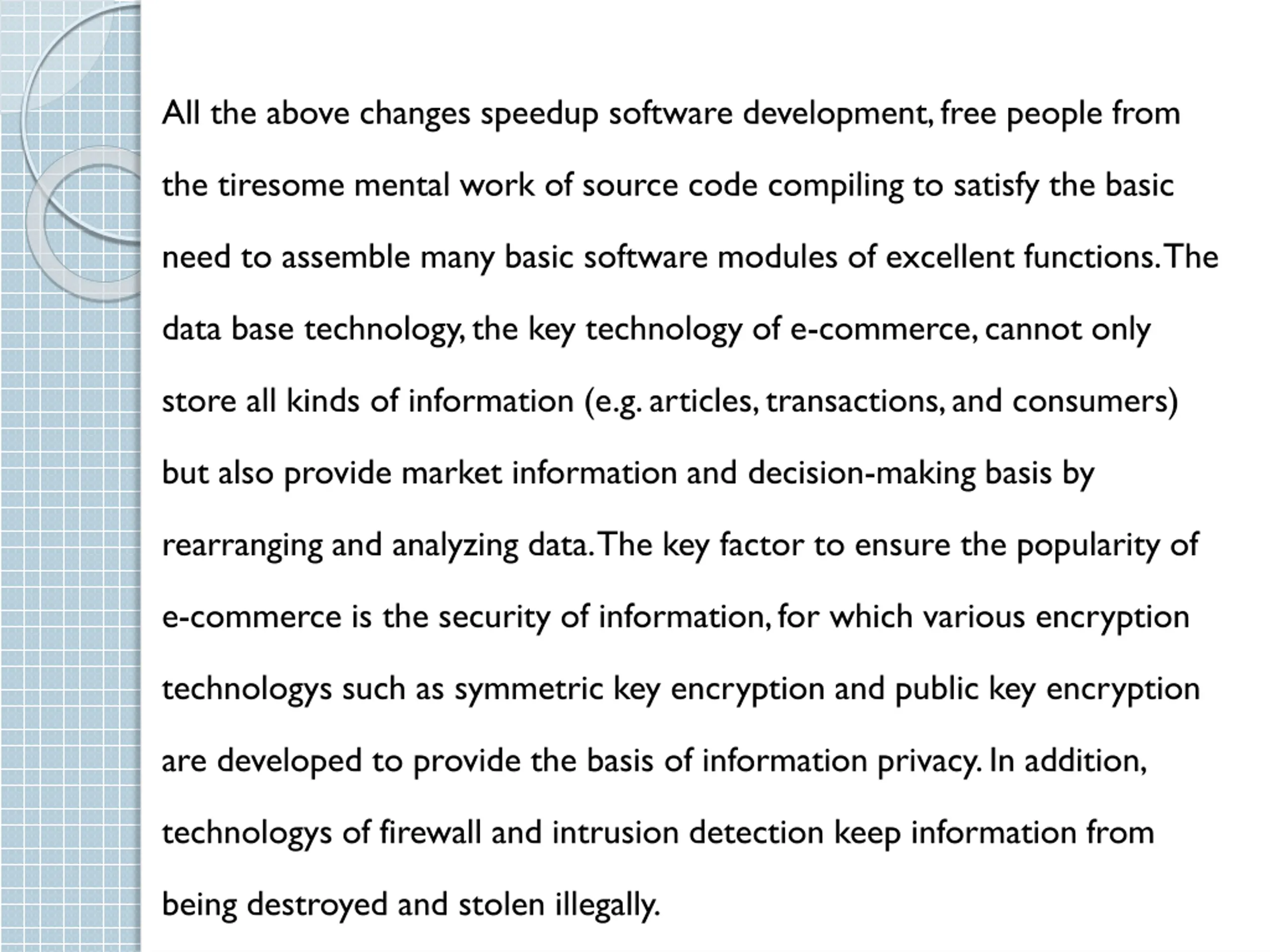 All the above changes speedup software development, free people from the tiresome mental work of source code compiling to satisfy the basic need to assemble many basic software modules of excellent functions. The data base technology, the key technology of e-commerce, cannot only store all kinds of information (e.g. articles, transactions, and consumers) but also provide market information and decision-making basis by rearranging and analyzing data. The key factor to ensure the popularity of e-commerce is the security of information, for which various encryption technologys such as symmetric key encryption and public key encryption are developed to provide the basis of information privacy. In addition, technologys of firewall and intrusion detection keep information from being destroyed and stolen illegally.